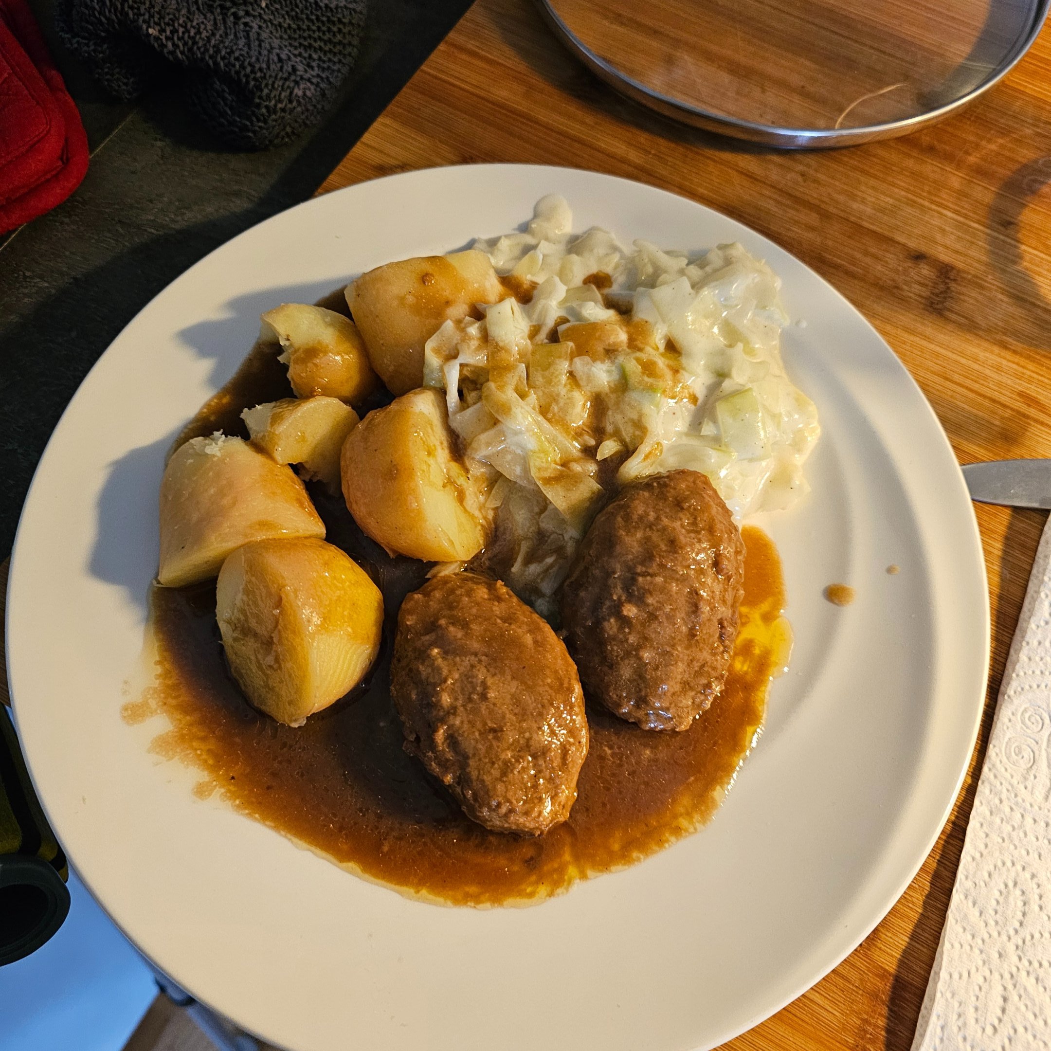 Duriello Skrevet tirsdag kl 14:27 Skrevet tirsdag kl 14:27 Kjøttkaker i brun saus, m/ poteter og kålstuing. 6