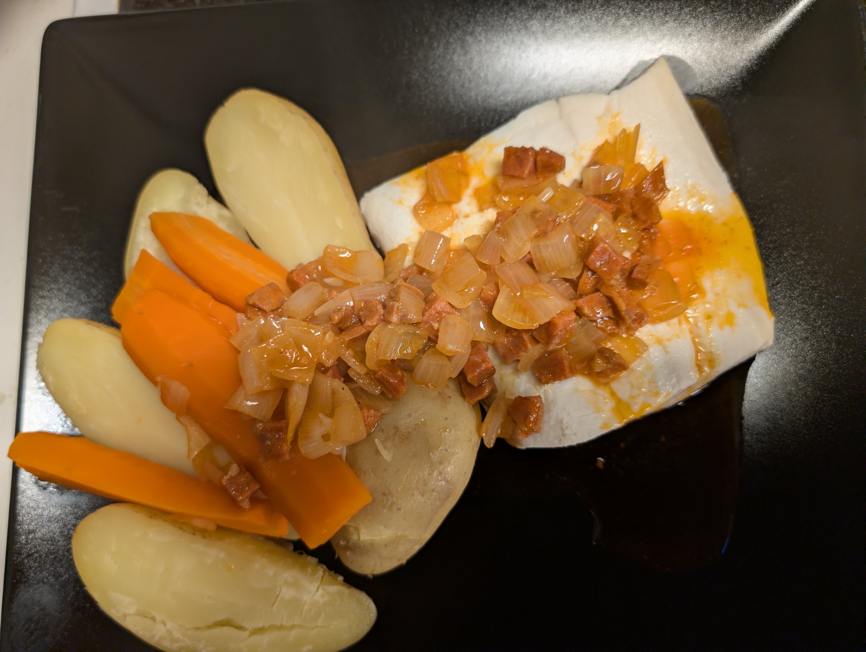 Dragavon Skrevet 2 timer siden Skrevet 2 timer siden Eit stykke kokt kveite med poteter og gulerøtter. Garnityren er chorizo og sjalottløk som har surret i en blanding av melange og chilisaus mens poteten kokte. Eg synest det er knallgodt til kokt fisk 😋 3