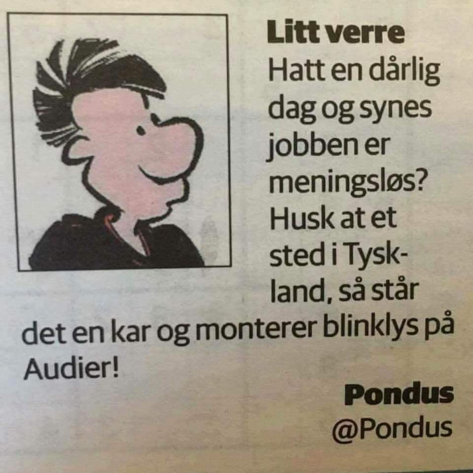 1Dr.E Skrevet 14. september 2018 Skrevet 14. september 2018 Dersom det var venstre blinklys: Bruk armen ut av vinduet før venstresvinger