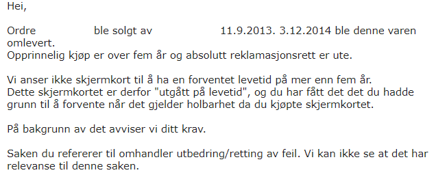 Thor. Skrevet 18. februar 2019 Forfatter Skrevet 18. februar 2019 (endret) Så da var "dommen" satt. Hei Opprinnelig kjøp ble gjennomført 11.09.2013 og klager fikk erstatning 03.12.2014. Han reklamerer så på erstatningsvaren 04.10.2018. Det har da gått over 5 år siden opprinnelig kjøp og vi anser ikke skjermkort til å ha en forventet levetid på mer enn fem år. På bakgrunn av dette må vi avvise klagers krav om erstatning/heving av kjøp. Hei, Da forstår jeg det slik at dere er enig i at det ble reklamert innenfor reklamasjonsfristen slik reglene er. Kravet avvises derimot fordi feilen ikke utgjør en mangel, grunnet at mangelsvurderingen tar utgangspunkt i kjøpstidspunktet, og feilen er innenfor hva kjøper kunne forvente av et skjermkort kjøpt i 2013. Jeg formidler løsningsforslaget videre til kjøper. Jeg har valgt å legge dette bak meg da grafikkortet allerede er erstattet med et bedre. Endret 19. februar 2019 av Thor.