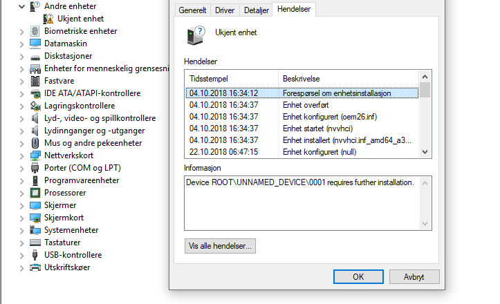 Darklordoo7 Skrevet 27. oktober 2018 Forfatter Skrevet 27. oktober 2018 Ok takk for svar. Var noe som het "ROOT\NVVHCI" som viste seg å være et eller annet nvidia relaterte greier.