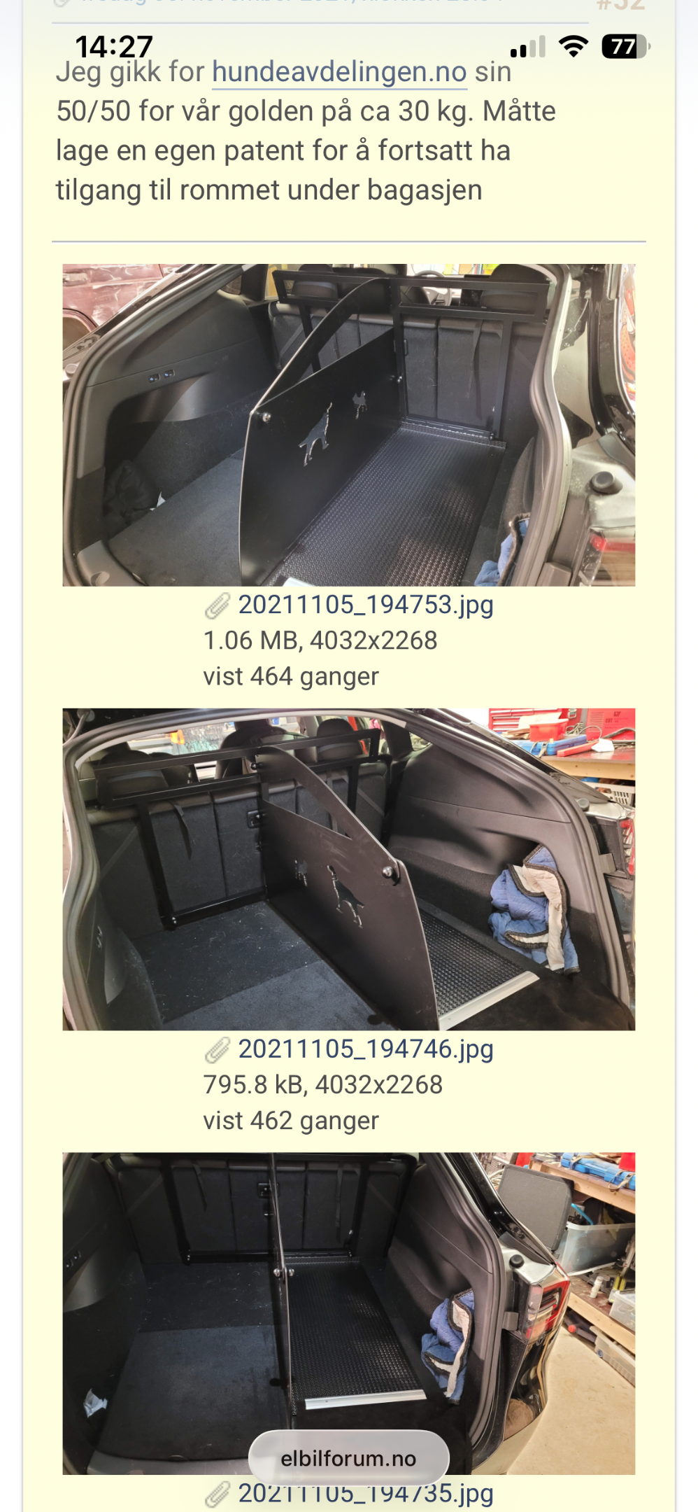 Tusen takk for bilder! Enig i at det ser ut som en fin løsning, men har litt skrekken for å ha noe mindre enn ett solid bur i bagasjerommet med tanke på påkjørsel bakfra. Derfor jeg heller mot at bikkja blir baksetepassasjer.