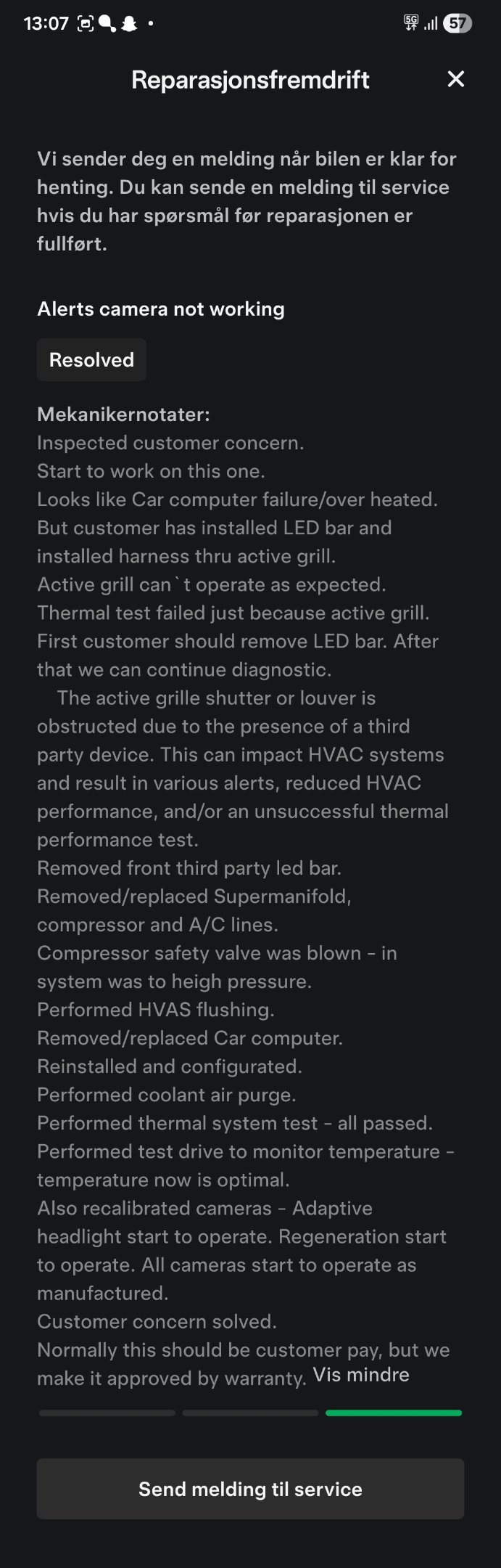 Fikk muntlig beskjed at den ene slangen for kjølevæske var underdimenjonert og at denne var grunnnen til dårlig kjøling som hadde overopphetet car computer. Fikk også beskjed om å ikke montere ledbar foran luftinntaket (slik alle med Tesla 3/Y gjør).