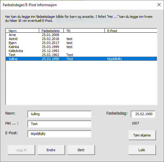 trn100 Skrevet 5. oktober 2019 Forfatter Skrevet 5. oktober 2019 (endret) Hei igjen Jeg overskuer ikke helt hvordan dette virker, verken mot regneark eller mot skjemaet internt. Men slik kan du skrive i en flerkolonnes listbox: Me.lstBarn.List(3, 2) = "Harald" Beste hilsen List(3, 2) Den koden virket! Legger like godt ved hele prosjektet. Driver og skriver om en del slik at enkelte variabelnavn etc. er endret i forhold til det som står over. For enkelthetsskyld har jeg lagt inn en liten blå knapp på noen av arkene som starter Hovedmenyen hvorfra man kan starte "problem" formen med "Fødselsdager". Det er KUN koden i userformen frmBarn jeg trenger hjelp til, så se bort fra alt det andre som på langt nær er ferdig. frmBarn skal brukes til å legge til, endre og slette informasjon i arket Bursdager (A005000). Det fungerer å legge til nye! Det fungerer å slette! Når jeg skal endre en post er det imidlertid KUN navnet som blir endret og jeg klarer ikke å se problemet? Rowsource til Listboxen i skjemaet er den dynamiske listen BursdagerUfiltrert. Takk på forhånd! Månedsplan-BH.xlsm.txt Endret 5. oktober 2019 av trn100