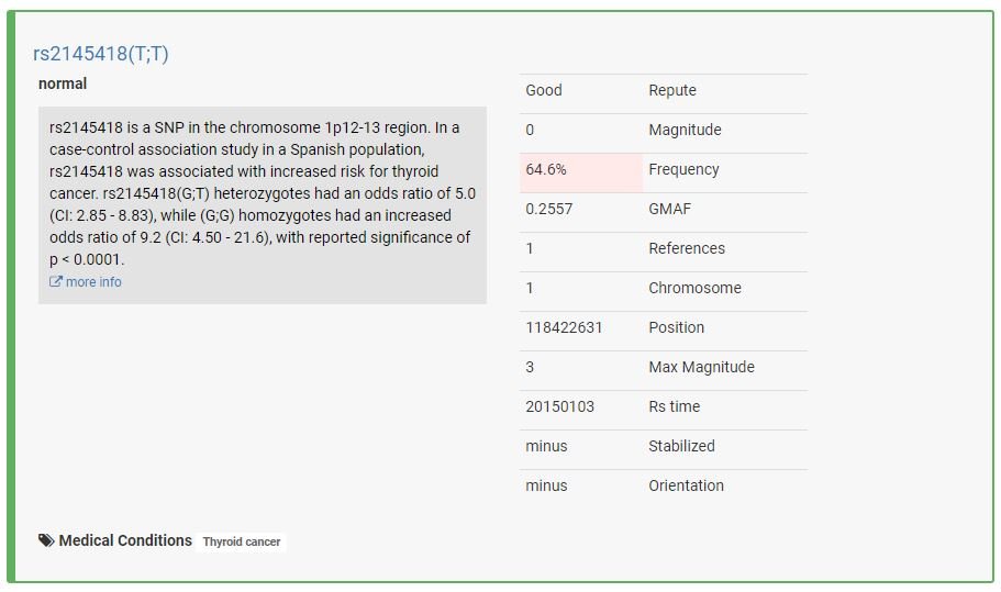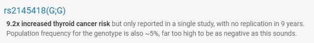 Ser at du har 9,2x risiko for thyroid cancer. Ser ut som min T-T gjør meg til normal på det, altså ikke en slik risiko. Men husk du kan ha andre styrker enn meg, og jeg kan ha andre svært negative ting i mitt genom enn du:
