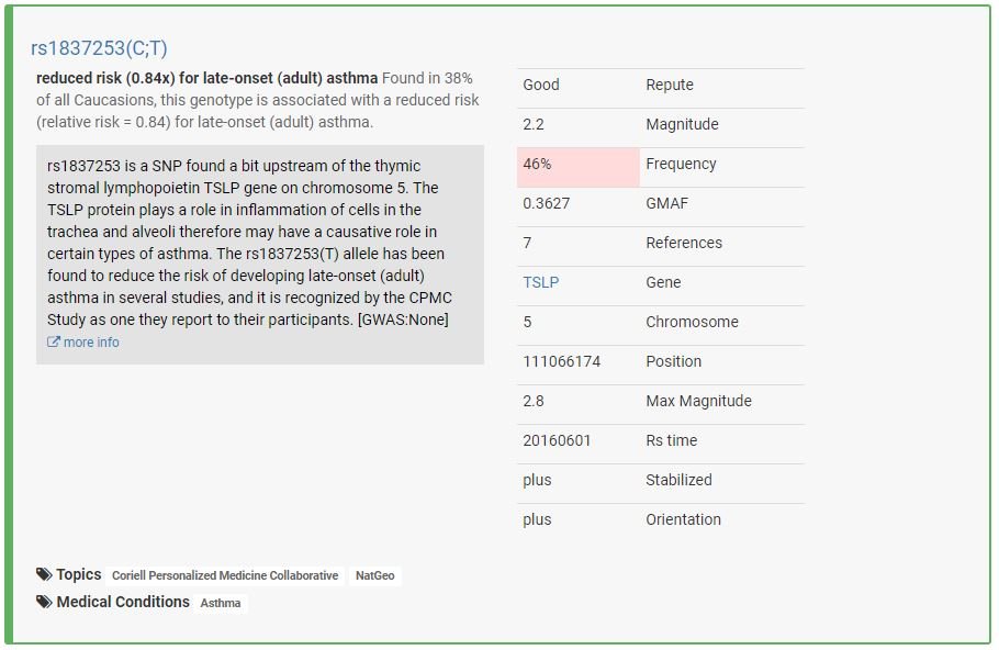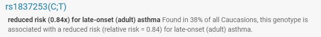 Nice one. Jeg deler nøyaktig samme rs1837253(C-T) også. Så jeg har skikkelig gode odds i å unngå å få asthma jeg da ?