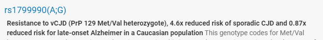 Vi har nøyaktig samme ATGC-kode for genet som koder for Creutzfeldt Jakobs (sånn som sauer og kyr får, og tydeligvis mennesker også). Prion-sjukdom.
