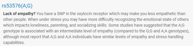 Ser ut som at de sliter med å bestemme seg litt på fenotyper. F.eks. så har jeg både treff for krøller og stritt hår. Som et eksempel. Så da kan de bomme på kreftlisten sin også. Bare for å ha sagt det. Eller forklaringen kan være at noe er mer dominant eller at en behøver en spesiell sammesetning for å risikere krøllene som jeg ikke har ?