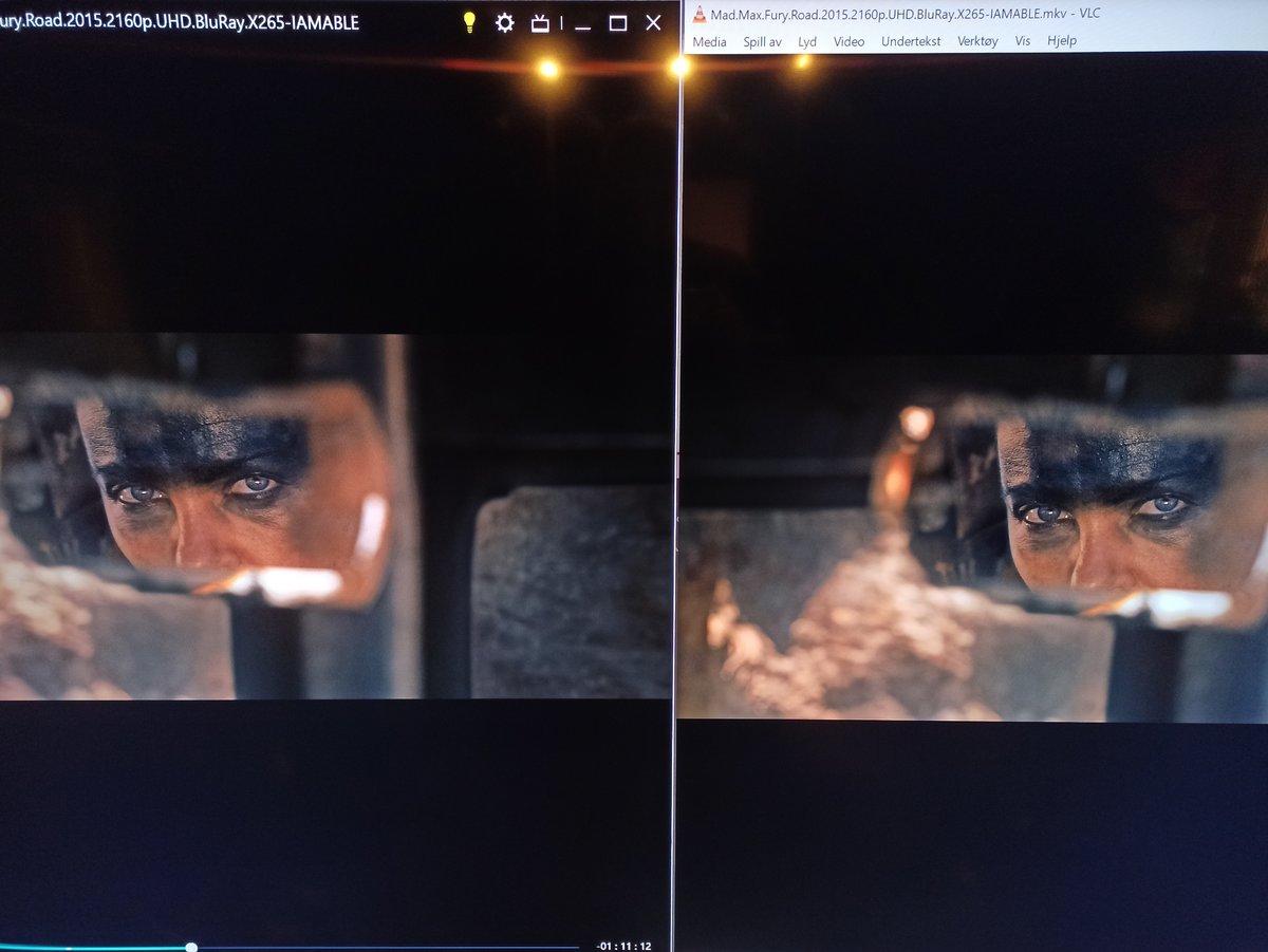 IceBlitz Skrevet 19. desember 2019 Skrevet 19. desember 2019 (endret) Holder på å bli litt smågal av å finne ut av dette. Har en GTX 1060 som forer en 82" Samsung QLED. 4K 10 bit HDR fungerer kjempefint. Problemet er at PowerDVD har annerledes hudtoner enn VLC og andre avspillere har, dette skjønner jeg ingenting av. Har deaktivert alt av video enhancements og lignende. Har testet PowerDVD side om side med VLC og 5Kplayer. VLC og 5Kplayer ser helt like ut mens PowerDVD skiller seg litt ut og er rødere i hudtonene. Noen forslag til hva som er galt? Det som plager meg mest er at jeg ikke vet hvilken som er den mest korrekte av PowerDVD og VLC. Ønsker jo såklart å se filmer slik regissøren har ment de skal se ut. Ser på ansiktet på bildet nedenfor. Venstre er PowerDVD og høyre er VLC. Endret 19. desember 2019 av IceBlitz