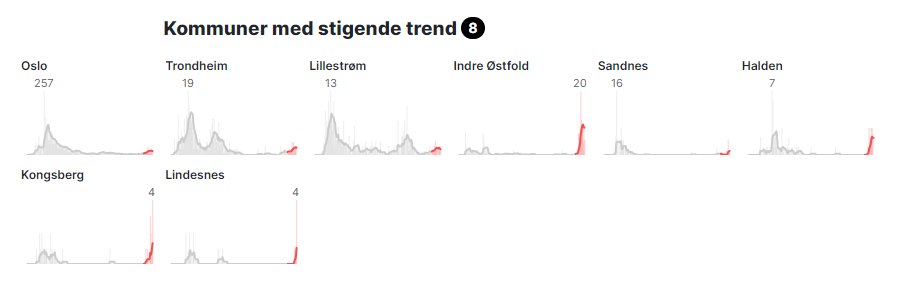 Flere kommuner med stigende trend siden fredag formiddag (over).