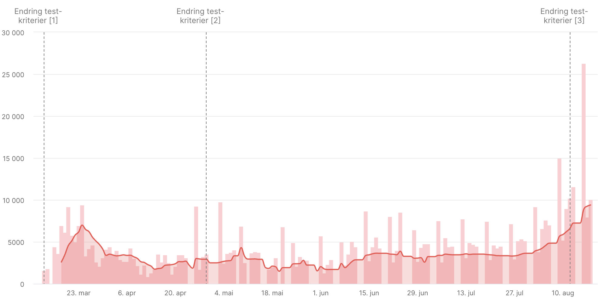 Ifølge Worldometer har vi nå testet 104.029 per 1 million innbyggere og kryper oppover den lista. Hvis alle testene hadde vært på unike personer, vil altså nå over 1/10 i landet ha tatt en test.