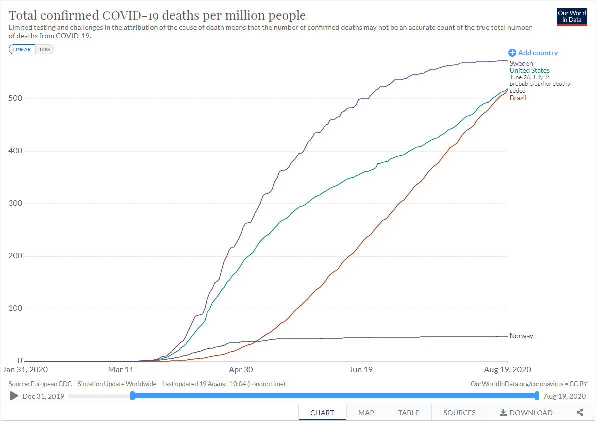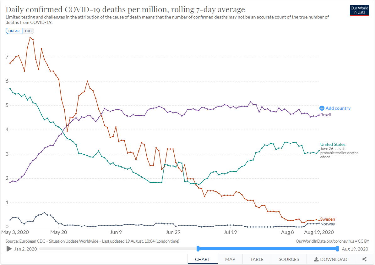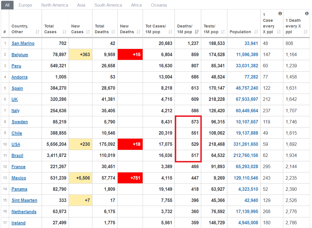 USA har over 10 ganger høyere dødsrate per million innbygger enn det Sverige har for tida (3 vs 0,3), så det er nok bare et spørsmål om tid før USA tar igjen Sverige på akkumulert antall dødsfall per million (529 vs 573). Edit: Brazil øker ennå raskere enn USA og passerer USA nå. Grafer og tabell i spoiler: