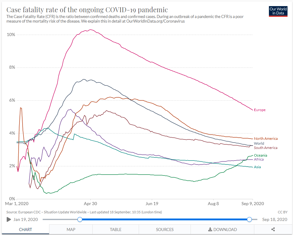 Spørsmål: Hvorfor hadde/har Europa så enorm CFR, case fatility rate, sammenlignet med andre verdensdeler?