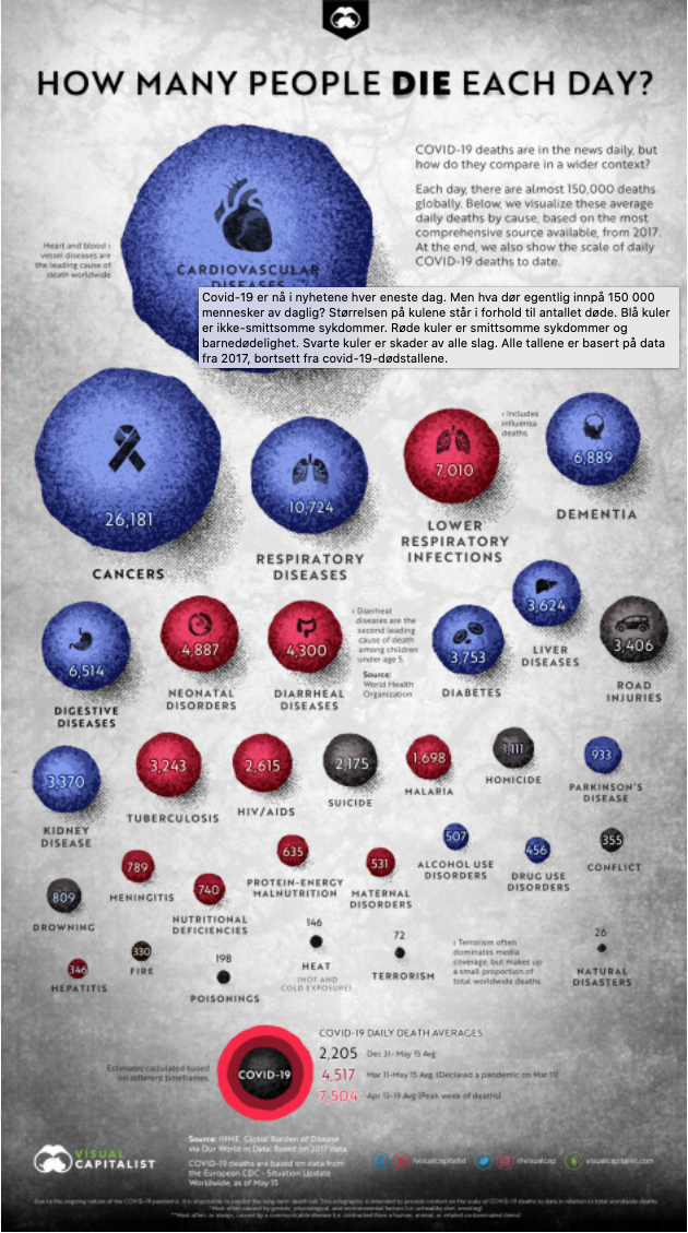 Denne plansjen som jeg postet tidligere sier ca 150 000 døde hver dag av andre årsaker enn COVID-19. Fremdeles er 150 000 lite av 7,4 milliarder mennesker.
