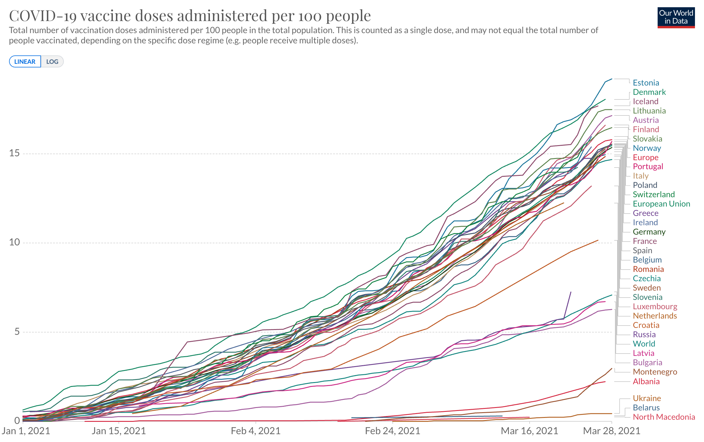 Vaksinering i europeiske land minus UK, Serbia og Ungarn som ligger milevis foran de andre:
