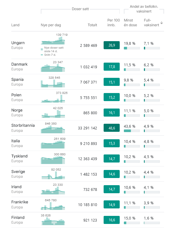 Norges tall er dessverre ikke oppdatert på fire dager i denne tabellen, så mulig vi er litt høyere. Vi er egentlig på 16,45 nå. Vi har sunket fra rundt 5-8 plass til litt lenger ned etter pausingen av AstraZeneca. Estland har føket i været i det siste, men de har bare 1,3 millioner innbyggere.