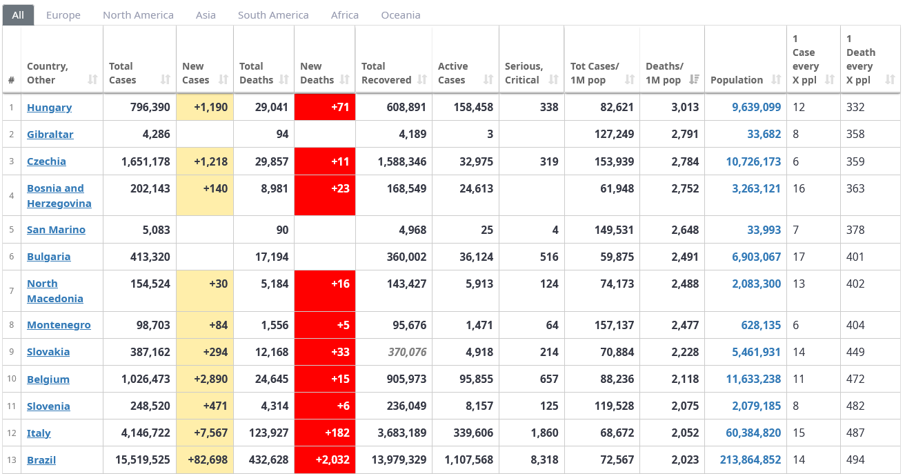 Ungarn er det første landet i verden til å (offisielt) passere 3000 coronadødsfall per million innbygger.