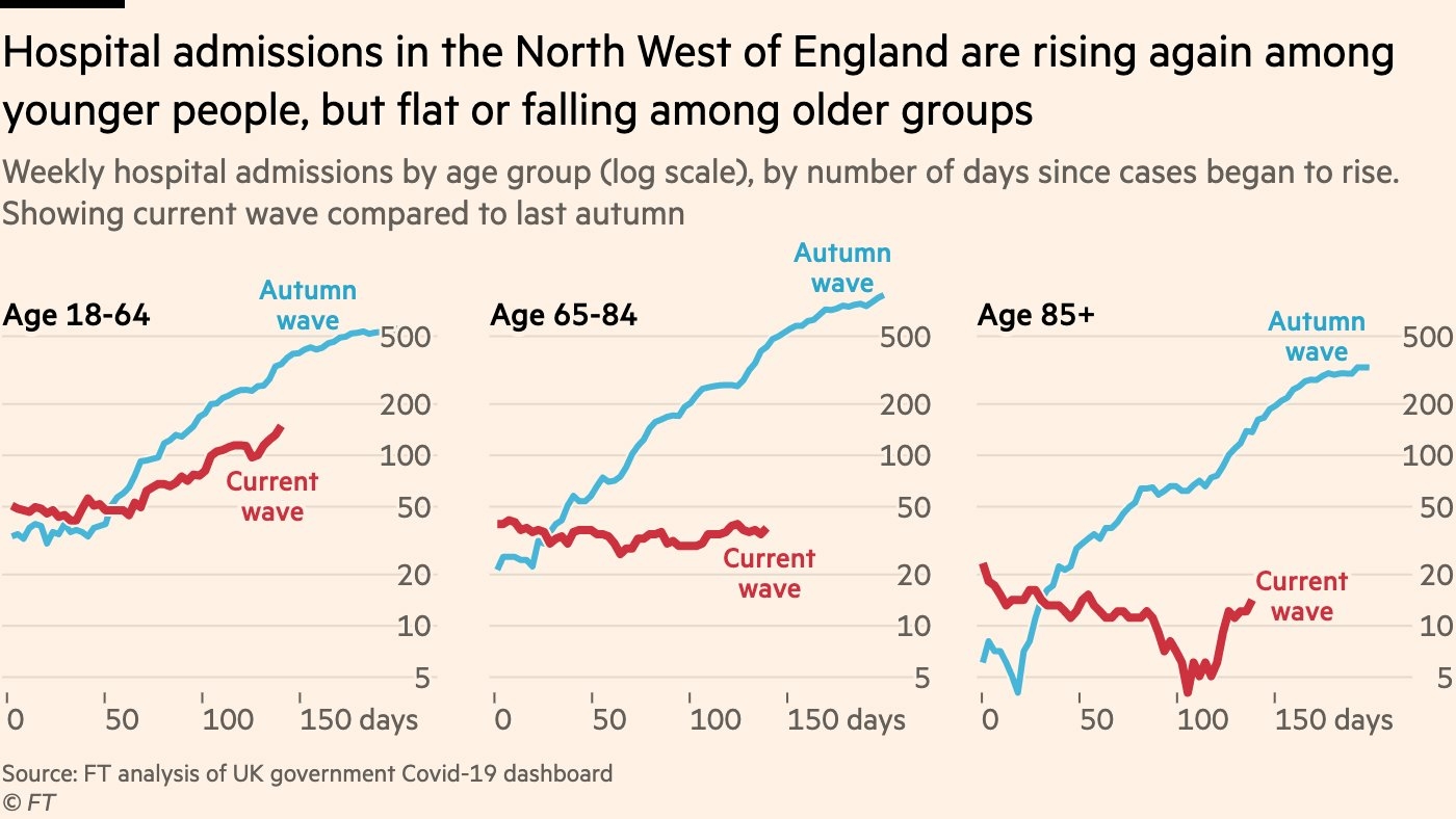 Se på grafen i tweeten over, så ser du at hvis innleggelser fortsetter å øke i samme tempo så blir det like mange innlagte som under bølgen de hadde i høst om noen uker. Siste uka i mai økte innleggelsene med 30%, og etter det har det økt videre med 40%. Så hvis det skulle fortsette vil de få stress på sykehusene igjen.