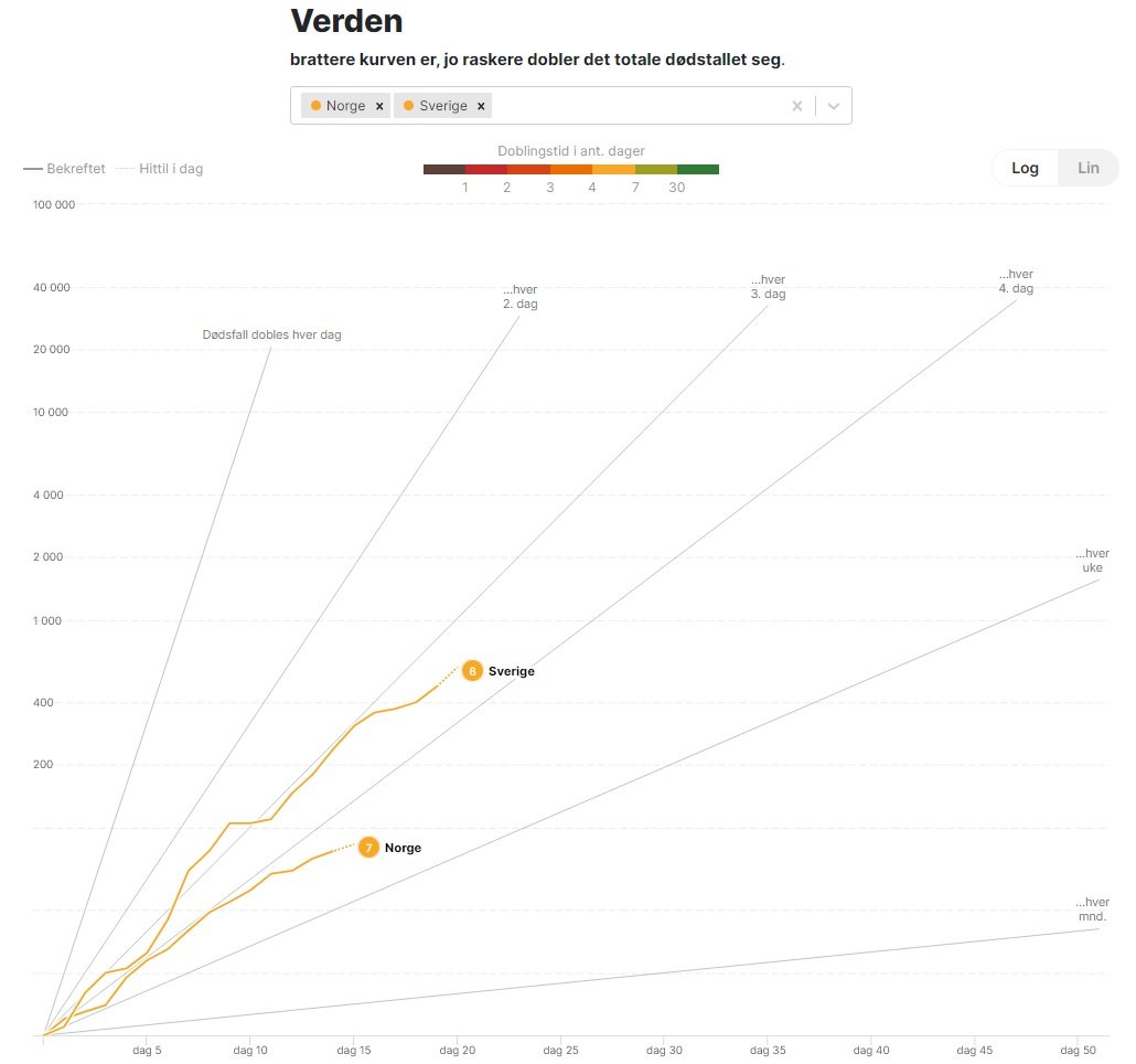 Konklusjon: Sverige har tydeligvis både større mørketall og høyere spredningstall enn oss. I grafen kommer nok Sverige til å fortsette med samme stigningsrate (for antall døde) i minst 2 uker fremover, mens vi sannsynligvis flater ut på et plattå.