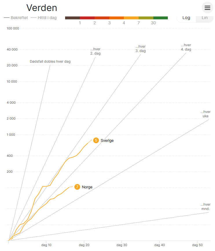 Ja Sverige må gjøre som Norge og Danmark det er helt klart. Antall døde per dag er det endelige beviset på det. Det som gikk feil i Sverige var at en trodde en burde sikte på immunitet i befolkninen. Dette har vist seg å være helt feil taktikk. Det en bør gjøre er å få så få syke som mulig. Det som jeg frykter nå kommer til å skje i Sverige er at for mange blir syke nå i dagene som kommer. Det er den store testen at det ikke blir for mange i forhold til kapasitet på sykehusene.