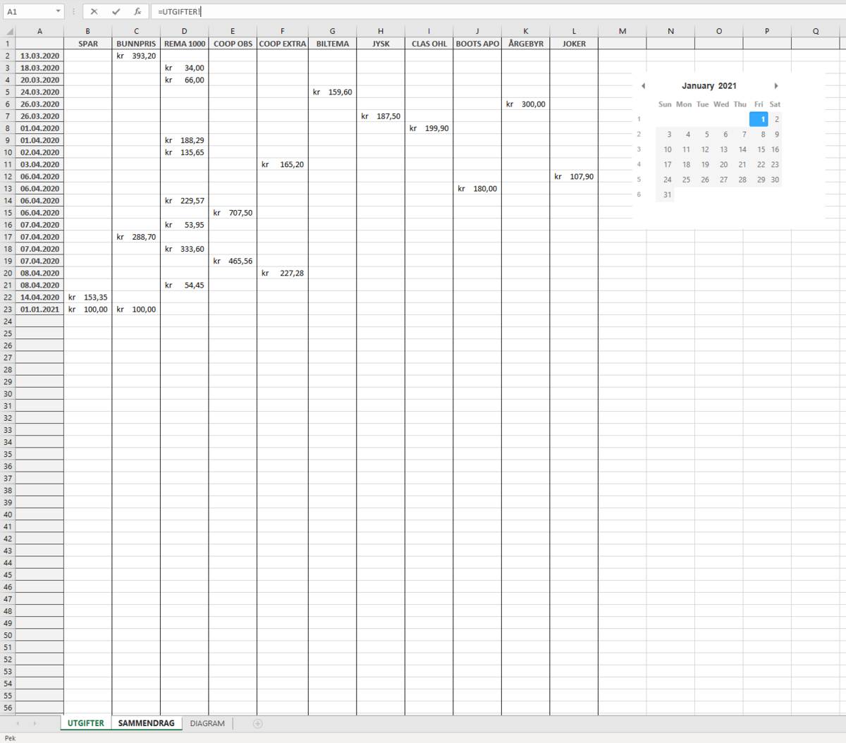 trn100 Skrevet 18. april 2020 Skrevet 18. april 2020 (endret) Hei. Du skriver ikke noe om det, men jeg regner med at det er Excel du bruker? Vil anbefale at du gjør dette ved hjelp av en pivot tabell som jeg viser i vedlagte eksempel.Dette vil spare deg en del ved inntasting av data i og med at du kan taste inn utgiftene fortløpende i vilkårlig rekkefølge og også kan legge til nye utgiftsposter fortløpende uten å måtte rette opp overskrifter/formler etc. Utseende på pivot tabellen kan du selvsagt tilpasse som du selv vil. Når du har lagt inn nye poster i UTGIFTER må du høyreklikke og velge OPPDATER i pivot tabellen. (Ev. klikke oppdater i menyraden) Dette kan selvsagt også gjøres i en makro. Som datakilde i pivot tabellen har jeg definert et dynamisk område som jeg har gitt navnet "Utgifter". Denne finner du under Formler - Navnebehandling i Excel og er satt opp til å velge de 10.000 første radene i inndata arket, men det kan du selvsagt utvide.Tester.xlsx Endret 18. april 2020 av trn100