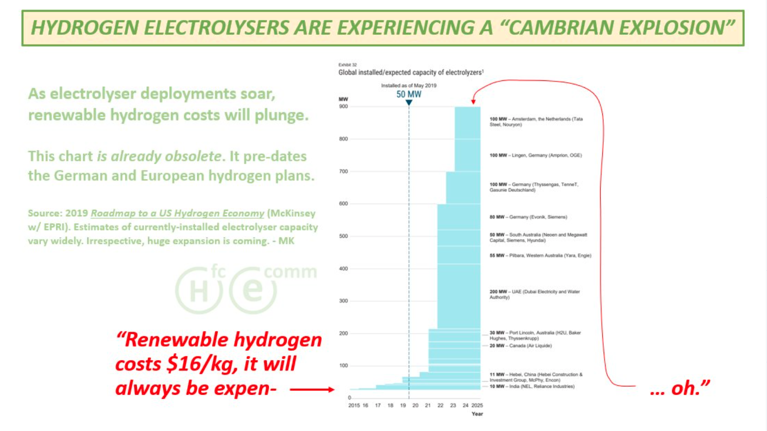 oophus Skrevet 23. juni 2020 Skrevet 23. juni 2020 Denne illustrerer veksten i litt perspektiv. Sammenligner man prisfall kun grunnet "economies of scale" i andre segmenter, så ser man altså hva som kommer. Alle analyser som har pratet om vekst og prisfall for elektrolyse har tatt feil, på samme måte som de tok feil i hurtigheten angående prisfallet for PV, vind og batterier. Mens McKinsey og Deloitte ser på nærmere 2030 som tidsrommet hvor elektrolyse kom til å koste $350/kW, så beviste Nikola nylig at det året er 2020/2021. Dette fra en kostnad på over $1000/kW året før. Kun fordi man skalerer opp fra 40MW til 360MW. Ytligere skalering derifra kommer med >1GW kapasitet, og analyser som har sett på kostnader for elektrolyse ved småskala vannkraft må kutte sin pris med >90% - allerede. Da vil det være ekstremt mange flere situasjoner som vil tjene på å inkludere en ekstra måte å eksportere ut energi på. 1