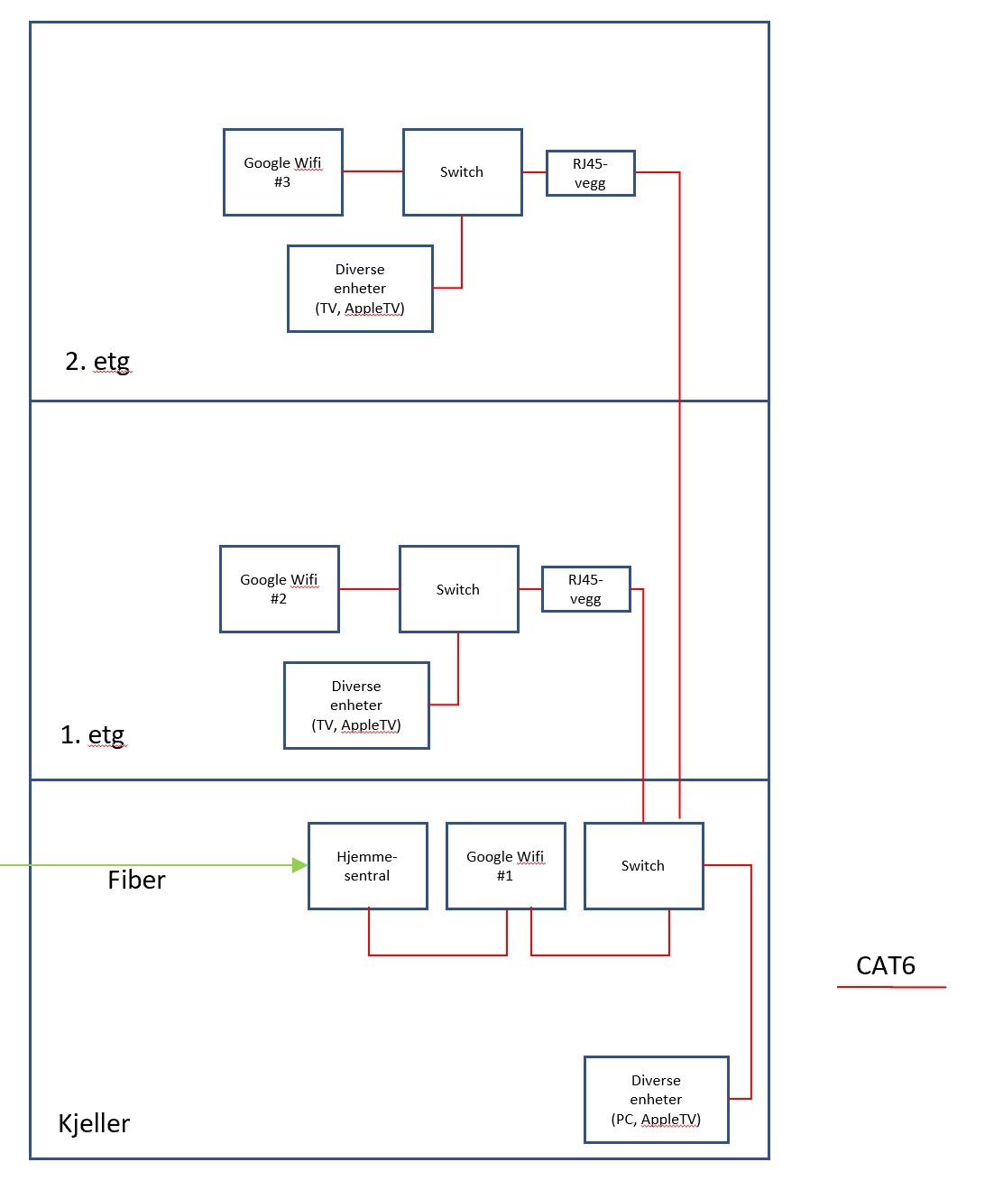 Ybbe Skrevet 9. september 2020 Skrevet 9. september 2020 Heisann dere, Har akkurat overtatt nytt hus og holder på å skissere opp nytt oppsett. Kommer fra et enkelt rekkehus med Google Wifi mesh (ingen daisy chain) og ønsker å rigge nye huset til et litt mer solid oppsett. Hovedsaklig grunnet størrelse. Har skissert opp et forslag basert på utstyr jeg har i dag, men ønsker tilbakemelding på eventuelle andre produkter som burde kommet med eller endring i oppsettet. Alle innspill tas i mot med åpne armer!