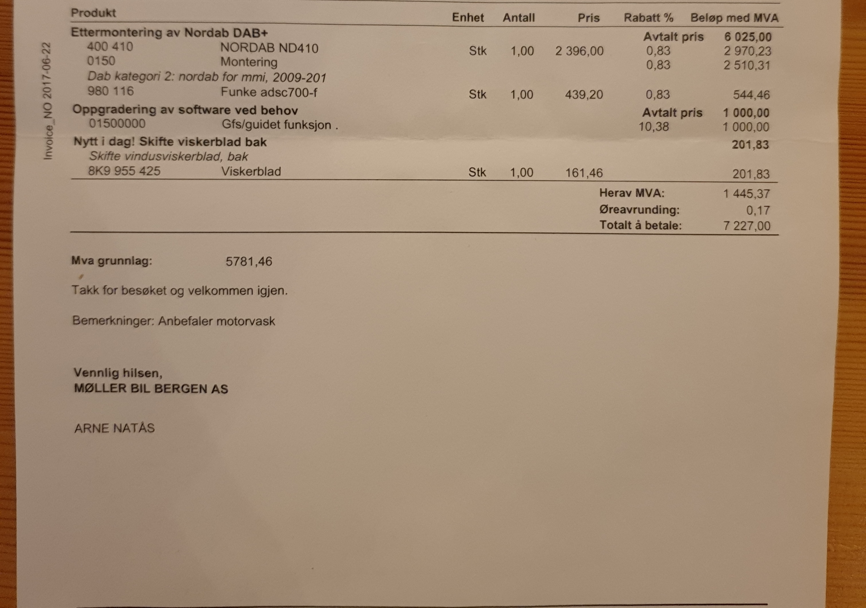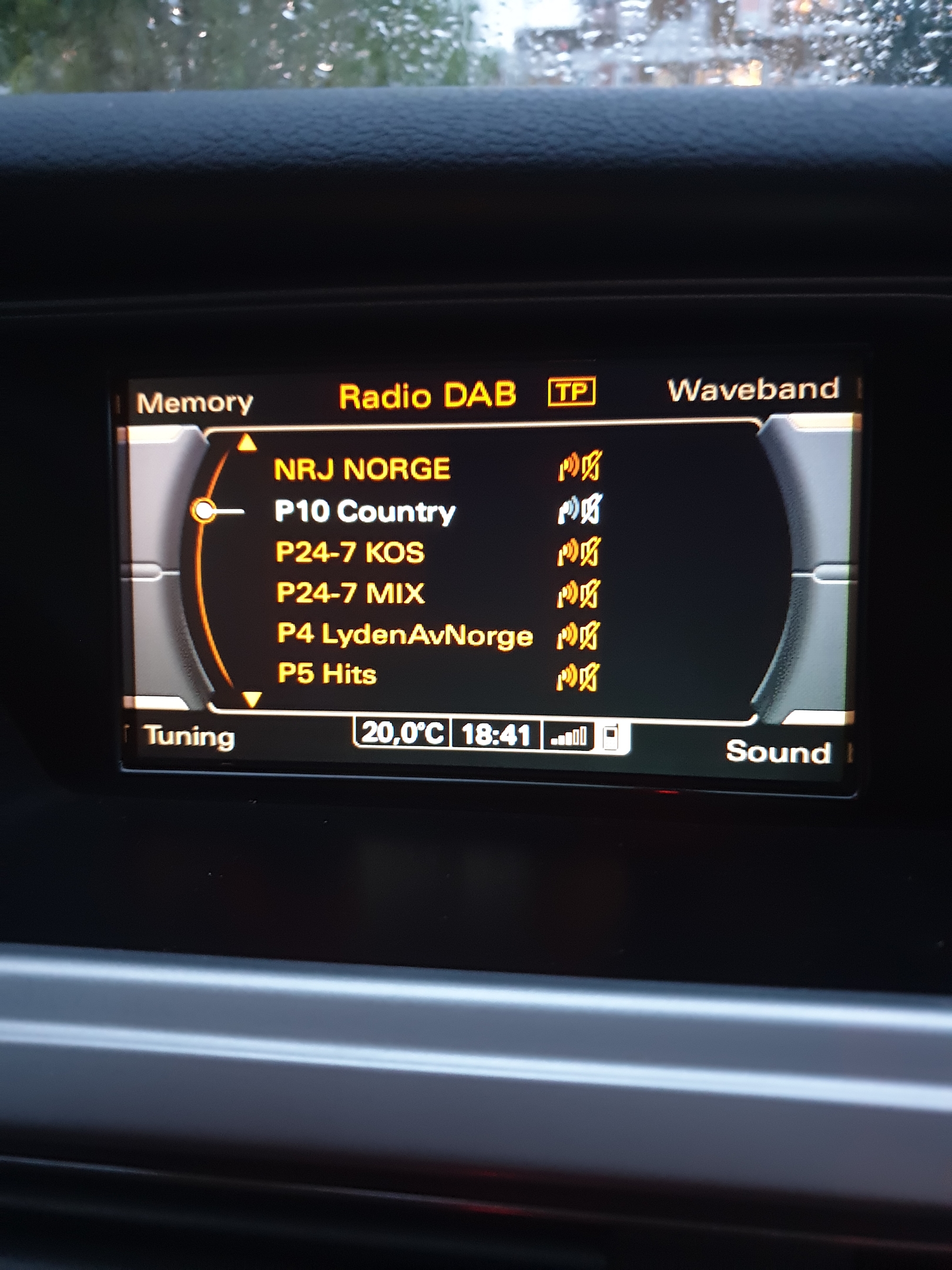 andreas.na Skrevet 5. oktober 2020 Skrevet 5. oktober 2020 Hei, jeg har en Audi A4 Allroad B8. Denne bilen kom ikke med DAB+ som ekstrautstyr. Derfor bestemte forrige eier av bilen å installere Nordab DAB+ hos Møller Bil for omtrent et år siden. Denne tyder på å ha fungert veldig greit, men har i det seinere stoppet å fungere. DAB-oversikten fungerer heilt greit, men jeg får ikke opp noe lyd ettersom det viser at jeg ikke har noe dekning. Jeg hadde satt stor pris på all tilbakemelding om hva som evt. kan være årsaken til problemet. Legger til noen bilder så det blir litt klarere 😃