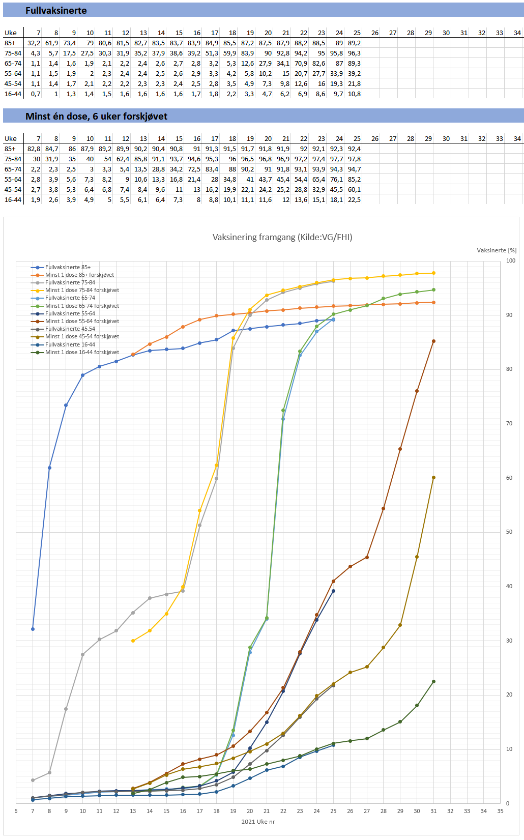 Nytt diagram over framgangen pr i dag. NB. grafene for første dose er forskjøvet 6 uker for å matche og vise hvor synkront det er med andre dose. Denne uka (25) har vaksinene gått hovedsaklig til førstedoser til de tre yngste aldersgruppene. Uke 26 blir nok ganske lik uke 25. I uke 27 flater nok den brune grafen ut godt over 90%.