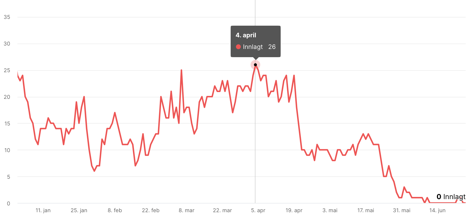 Se på Sarpsborgs graf på smittede og innlagte på tilknyttet sykehus gjennom pandemien, Tromsø er ikke en gang i nærheten. Før i det siste naturligvis, etter Sarpsborg har kommet lengre i vaksineringen.