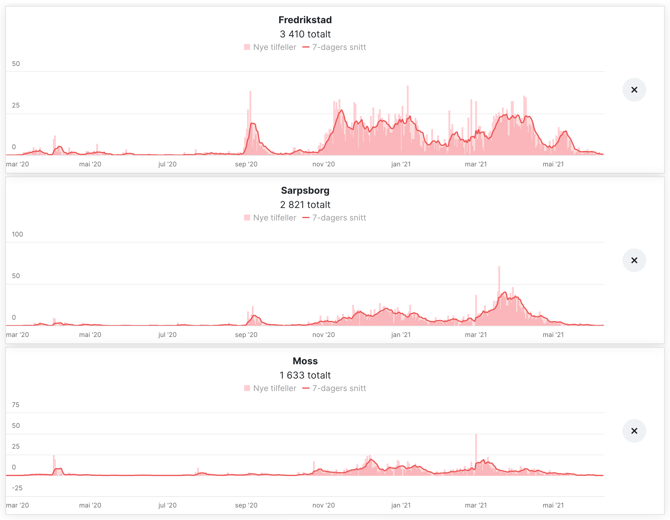 Jupp, men til gjengjeld har det fungert å prioritere til disse tre bykommunene som hadde høy smitte vedvarende over lang tid, uten aldri å få kontroll. Det var disse byene samt Oslo og Lørenskog som hadde brorparten av sykehusinnleggelsene i landet, men nå er det knapt noen og de totale innleggelsene har sunket drastisk i Norge. Så jeg vil si at den omprioriteringen de gjorde tidlig i vår fungerte til formålet.