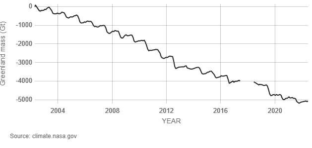 Marella Skrevet 3. september 2022 Skrevet 3. september 2022 Salvesen. skrev (51 minutter siden): https://climate.nasa.gov/climate_resources/264/video-greenland-ice-mass-loss-2002-2020/ Greit med litt fakta Det er tatt høyde for i grafen fra DMI lenger oppe.