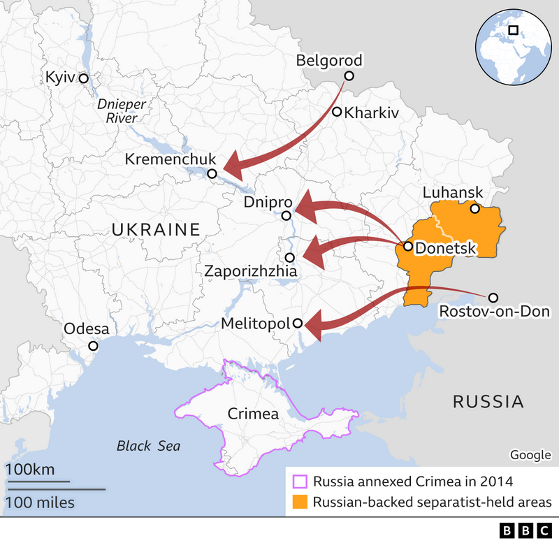 Her er et kart fra BBC som prøver å foreslå hvordan Russland kan invadere videre inn i Ukraina. Spesielt byen Kharkiv ligger utsatt til om invasjonen kommer fra nord. Ukrainske styrker i øst kan også bli omringet.