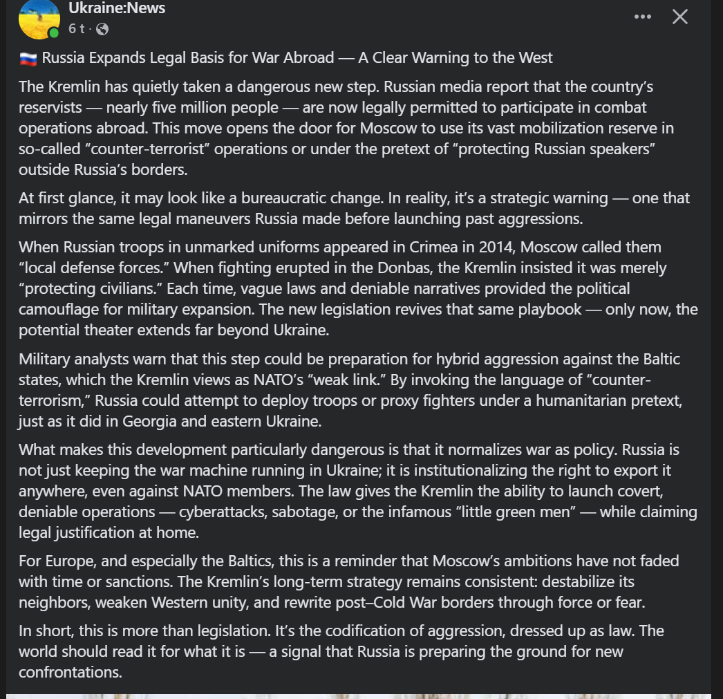 oddeh Skrevet 2 timer siden Skrevet 2 timer siden The Kremlin Gives Putin Free Hand to Send Up to 2 Million Reservists Into Battles Abroad We are conducting very real and large-scale combat operations, but officially no war has been declared,” Zhuravlyov said. “These legal technicalities limited the Defense Ministry’s flexibility—now they’ve been removed.” He explained that the law targets individuals who previously served voluntarily and currently receive payments and benefits as reservists. These troops, he added, will now be mobilized “far more frequently than before,” which he called “entirely normal, given the situation our country faces.” According to the proposal, reservists will undergo “special training” for defense-related tasks lasting no longer than two months. https://united24media.com/latest-news/the-kremlin-gives-putin-free-hand-to-send-up-to-2-million-reservists-into-battles-abroad-12463 4