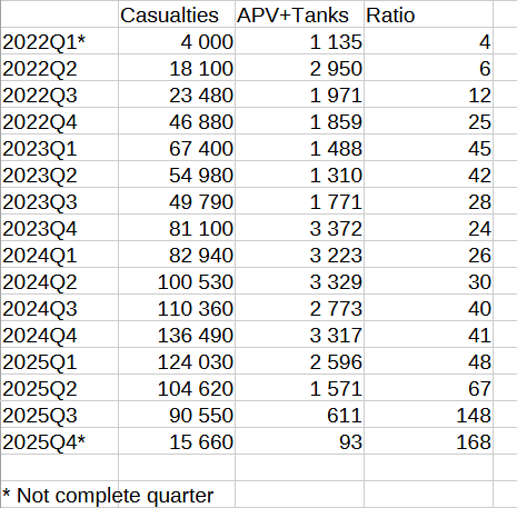 torbjornen Skrevet 15 minutter siden Skrevet 15 minutter siden Simen1 skrev (5 timer siden): Jeg har hentet fram litt statistikk over hvordan det går på slagmarka. Nærmere bestemt casualties versus pansrede kjøretøy og jeg ser at den generelle trenden ikke akkurat lover godt for det russiske kjøttet som står i kø for kverning. De kan se langt etter pansret støtte. Årsaka er vel ikkje berre mangel på pansra køyrety, men at dronene skaper dødssoner der pansra køyrety har små sjansar for å komme gjennom.