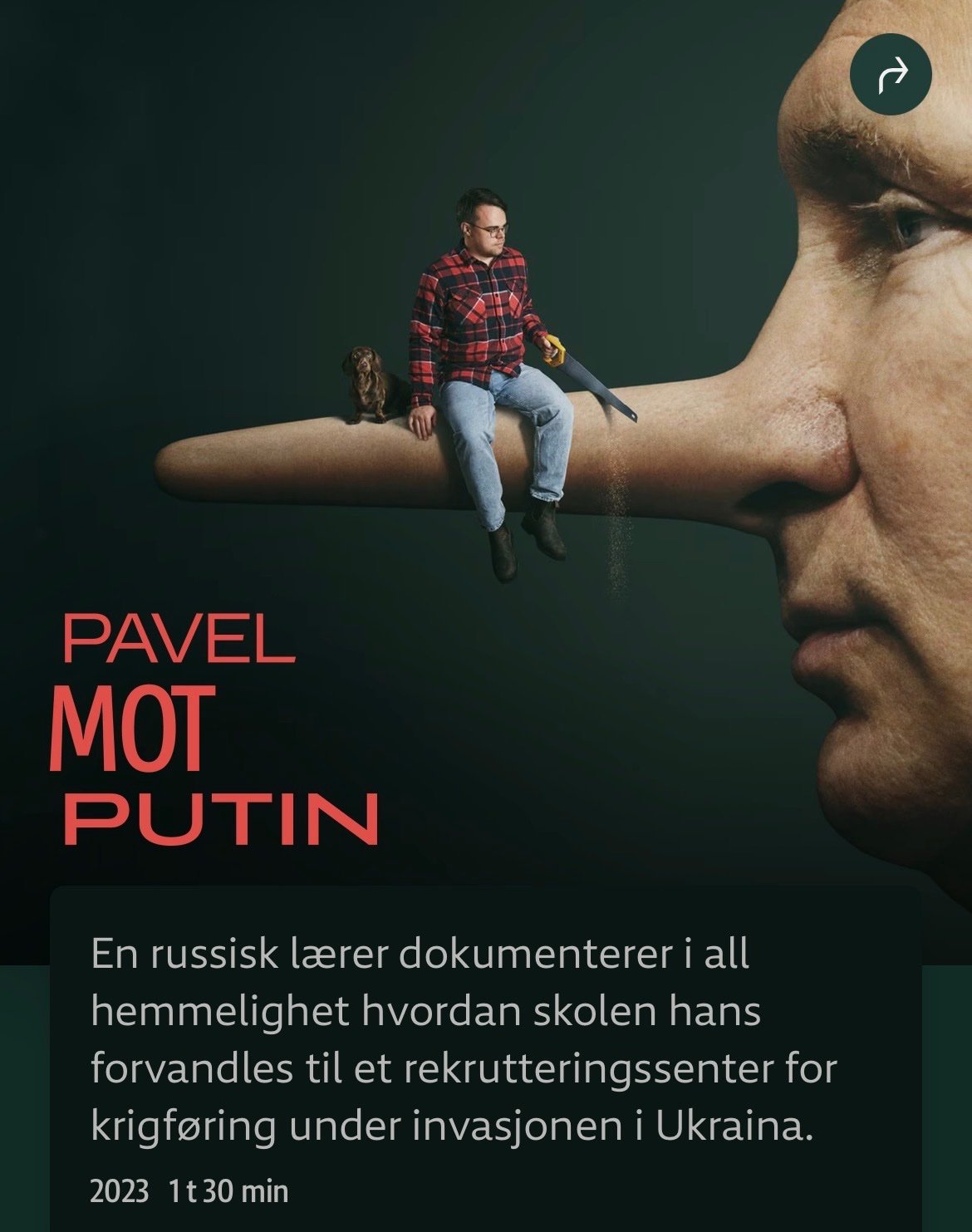 qualbeen Skrevet 31 minutter siden Skrevet 31 minutter siden (endret) Sitat Pavel mot Putin En russisk lærer dokumenterer i all hemmelighet hvordan skolen hans forvandles til et rekrutteringssenter for krigføring under invasjonen i Ukraina. https://tv.nrk.no/program/KOID28001623 Endret 29 minutter siden av qualbeen