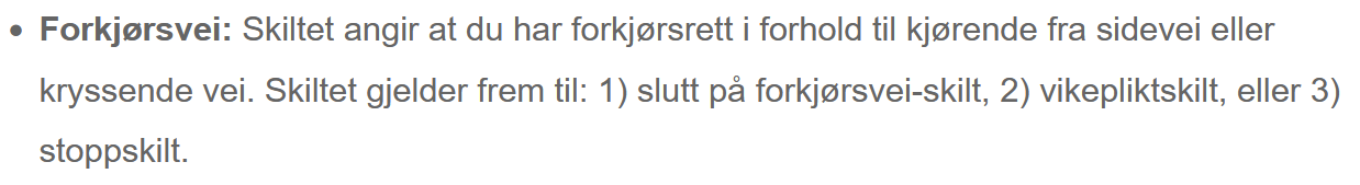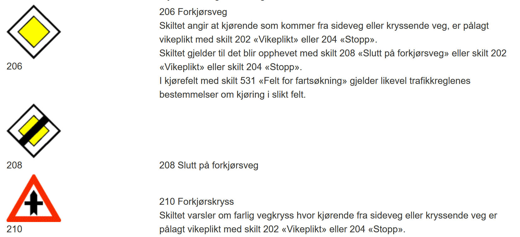Thunderhead Skrevet 3. april 2022 Skrevet 3. april 2022 5 hours ago, SeaLion said: Forkjørsrett eksisterer ikke i trafikkreglene, kun vikeplikt. Man har aldri forkjørsrett, men man kan tildeles dette ved at de som har vikeplikt faktisk viker. Forkjørsrett fantes tidligere i trafikkreglene, men da mange oppfattet det som en påkjørsrett, så ble reglene endret. Den som har vikeplikt er derfor pålagt å tydelig vise at vedkommende har til hensikt å overholde vikeplikten, ved f.eks redusere farten i god tid før vikepliktspunktet. Å kjøre i full fart mot ei vikepliktslinje og der bråstoppe er egentlig ikke tillatt, fordi vedkommende da ikke tydelig viser at vedkommende vil overholde vikeplikten. Hvis den som ferdes på en forkjørsvei ikke tror at at den som kommer fra en sidevei kommer til å overholde vikeplikten er regelen faktisk at den som ferdes på forkjørsveien skal redusere farten og eventuelt stoppe for å kunne unngå en ulykke. Så en bussjåfør har egentlig ikke lov å presse seg ut på veien hvis ingen overholder vikeplikten. Hvordan forklarer du disse skiltene? 1 1