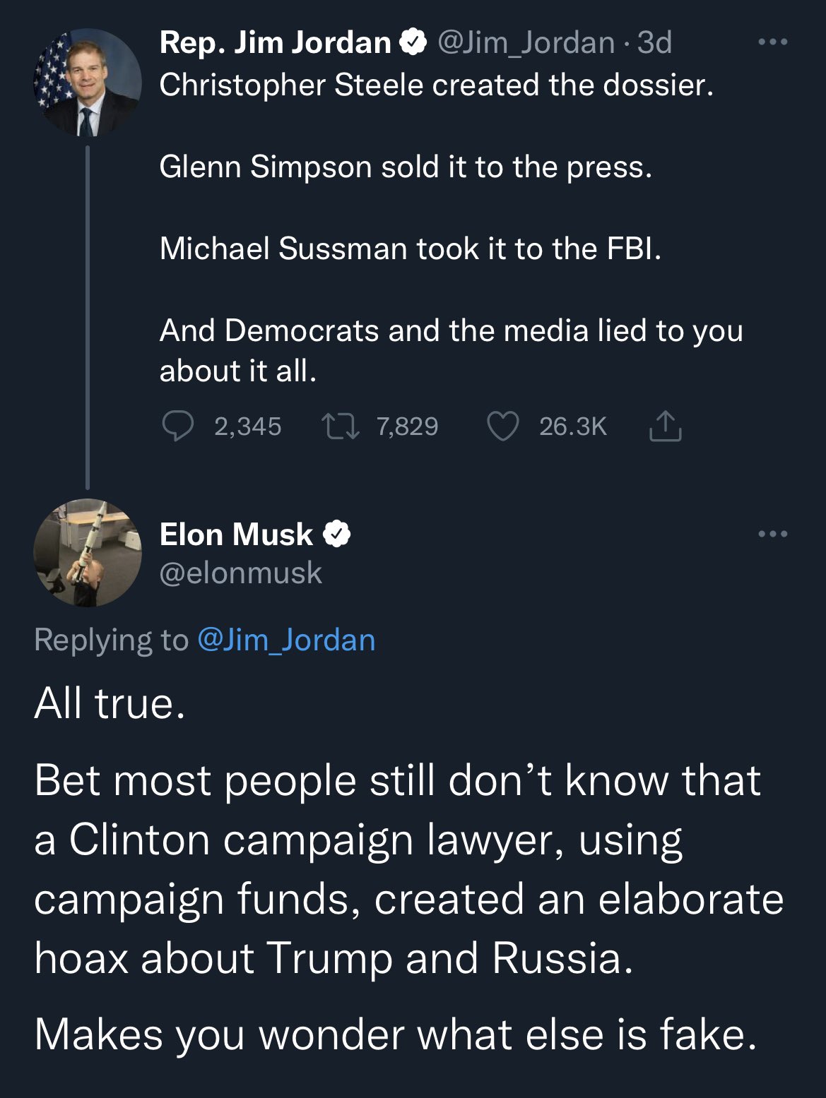 Red Frostraven Skrevet 23. mai 2022 Skrevet 23. mai 2022 jallajall skrev (På 22.5.2022 den 13.14): Jordan kom med fire konkrete påstander i tweeten. Disse fire punktene ble kalt "konspirasjonsteorier fra qanon", til tross for at de er faktuelt sanne. Jordan spilte på hundefløyten. Elon Musk bjeffet. Musk demonstrerte hva folk som hører på folk som Jim Jordan ender opp med å tro på. La oss bare kjapt gå gjennom poengene: Sitat Med Time sin artikkel som referanse: https://time.com/5610317/mueller-report-myths-breakdown/ Første påstand impliserer noe grovt villedende; Det impliserer det falske narrativet om at FBI etterforsket Trump på grunn av demokratene, på grunn av Steele Dossier. Som ikke er sant, av flere grunner. Men det er en hundefløyte -- man kan ikke vite sikkert hva han hinter til. Det er uansett faktuelt riktig at Steele skrev Steele Dossier -- selv om budskapets avsender åpenbart farger budskapet som en hundefløyte -- det hinter til konspirasjonsteorien om at demokratene fikk startet etterforskningen mot Trump. Sitat Myth: The investigation began with the Steele dossier. Response: According the Mueller report, the investigation began in July 2016 after Wikileaks had released materials stolen from the computers of the Democratic National Committee. The FBI received information from a foreign government that Trump campaign adviser George Papadopoulos had told one of its representatives that “the Trump Campaign had received indications from the Russian government that it could assist the Campaign through the anonymous release of information damaging to Democratic presidential candidate Hillary Clinton.” Mueller’s report states, “That information prompted the FBI on July 31, 2016, to open an investigation into whether individuals associated with the Trump Campaign were coordinating with the Russian government in its interference activities.” Mueller makes no statement to indicate that the investigation was predicated on the Steele dossier, a series of reports that were compiled by former British intelligence officer Christopher Steele, who was hired by a research company that was working for a law firm paid first by a conservative website and later by the Clinton campaign. Andre påstand har jeg ikke sett beviser på. Jeg regner med at du har konkrete beviser på at Simpson solgte den til pressen..? At Sussman tok den til FBI er impliserer igjen til et narrativ -- er en henvisning til en ide om at begge sider er like, at begge sider misbruker FBI sine ressurer. Alvorlig talt: Om man oppdager at en politisk kandidat virker å kunne være er en Manchurian Candidate, så har man et samfunnsansvar -- uansett politisk overbevisning. Og den forståelsen har vist seg å være riktig -- om man ikke er farget av misinformasjon fra Russland og/eller Republikanerene. Jeg tror at Sussman gikk til FBI av frykt for landet sin sikkerhet, og at han i så fall gjorde det rette, og hadde rett. Siste påstand er grov løgn, igjen en both-sides anklage. Demokratene og media løy ikke når de anklagde Trump for å konspirere med Russland, eller fortalte det faktum at Russland hjalp Trump, eller når de anklaget russland for å angripe USA via Trump og hans folk og det republikanske partiet før øvrig. Mueller sin rapport ble urettsmessig sensurert av Bill Barr -- spesifikt, mye av Russland sine gjerninger hadde blitt sensurert, og ble først frigitt sommeren 2020 -- før Bill Barr ville blitt tvunget til å frigi materiale gjennom en rettsordre. Han slapp red Tweeten, totalt sett, er åpenbart mer på siden misinformasjon og hundefløyte enn sann, mer basert på misinformasjon enn sannhet.. En forståelse Elon Musk sementerer med sitt svar. ...og det å automatisk anta at hva Jim Jordan sier er galt er en fornuftig refleks, selv om han faktisk ikke kan sies å ha totalt galt denne gangen -- han bare impliserte de falske forestillingene han og hans konspirasjonsteoretikere og medkonspiratører sprer. https://www.justsecurity.org/77852/timeline-rep-jim-jordan-a-systematic-disinformation-campaign-and-january-6/ 3