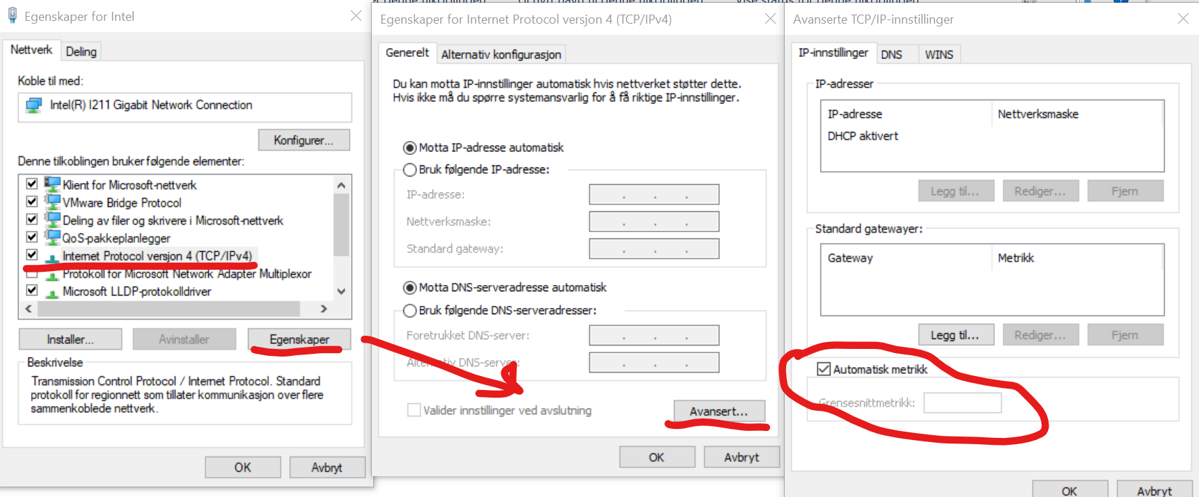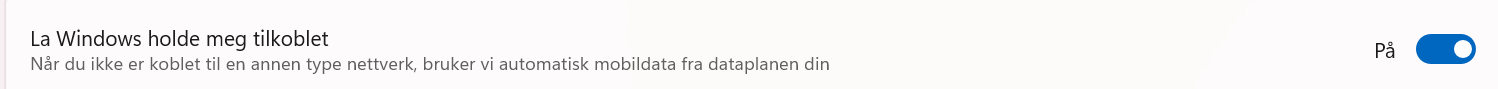 St. Anders Skrevet 26. juli 2022 Skrevet 26. juli 2022 Har opplevd tidligere om jeg husker rett at å endre i cmd ikke alltid vil endre metrikk permanent, og dermed vil det ved statusendring muligens tilbakestilles. (men dette må potensielt gjøres for ipv4 og ipv6). Men å sette prioritet i komandolinje burde virke. Du har ikke en programvare fra lenovo som overstyrer? Ref bilde kan du prøve å sette manuell metric på eks 10 på LAN 50 på WIFI kortet og 100 på Mobilkortet. Auto skulle i prinsippet gitt deg lavest på LAN så WIFI også Mobil, men automatisk skal om jeg husker rett være høyere enn det høyeste du skriver i feltene manuelt. Tidligere var det mulig å endre hvilket kort som skulle prioriteres slik at du kunne satt det opp med først ethernet så wifi så mobil i et enkelt vindu der du bare dro ting opp eller ned, men dette har de fjernet fra nettverk og delinssenter i de siste versjonene. I Windows 11 så kan du velge på mobilnettverkskort: I komandolinje når du skriver "route print" etter at du er koblet opp med LAN, WIFI og LTE, ser du da hvem som har lavest metric?