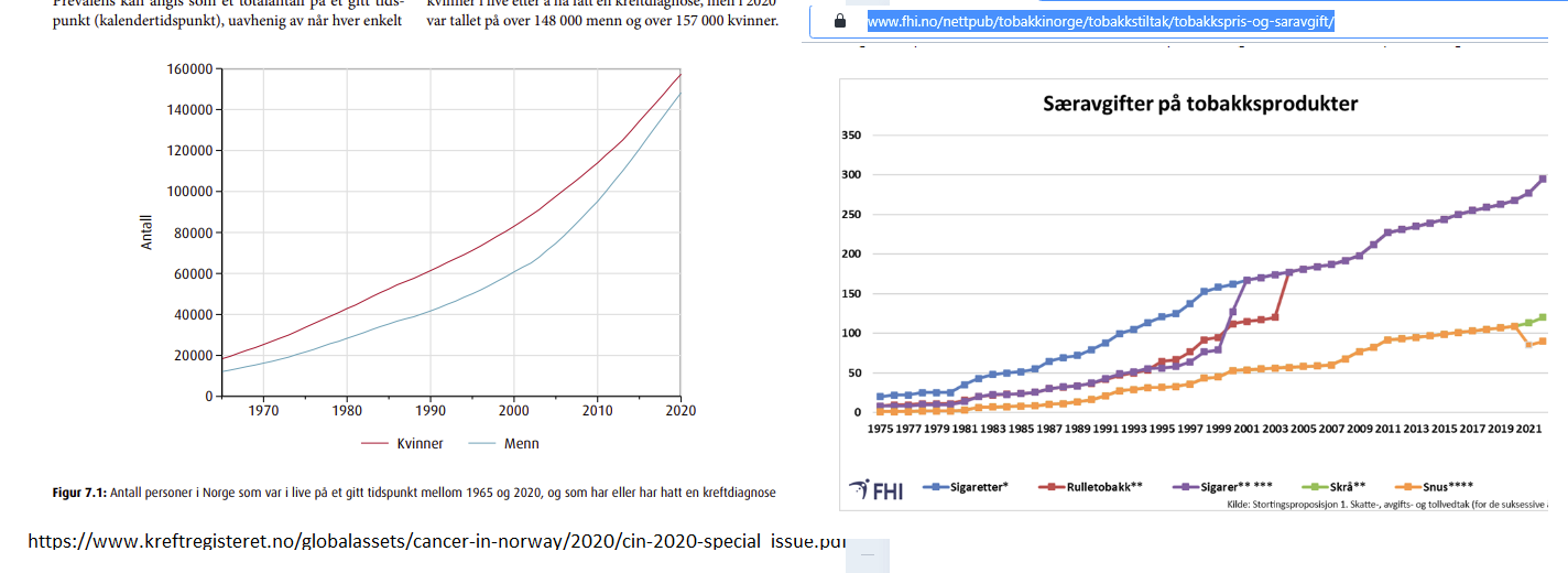 KongRudi Skrevet 8. august 2022 Forfatter Skrevet 8. august 2022 6 hours ago, Comma Chameleon said: Trådens største løgn. Røyking skader MANGE flere enn kun deg selv. Og med tanke på at røyking ikke gir noe positivt så er det helt greit at vi gjør det vi kan for at folk aldri skal røyke. Du lukter røyk, og kan enkelt flytte deg, eller be røykerene gå lenger bort fra deg... Du ser røyk og kan enkelt flytte deg, eller be røykerene gå lenger bort fra deg... Det er ikke lenger lov å røyke innendørs på offentlige steder - du blir ikke sjenert innendørs av røykere lenger.. Det er nikotinen og tjæren som farlig i røyken. Du skal innhalere veldig mye før dette er noe du trenger å bekymre deg for, hvis du ikke røyker selv så er det ikke særlig farlig for deg i Norge tør jeg påstå.. Utendørs forsvinner det ganske kjapt... Og hvis du oppdager røyk, så er det bare en nyttig advarsel til deg at andre puster ut i nærheten - altså en nyttefaktor i disse livsfarlige pandemi-tider.. 😕 Og røyk har positive egenskaper om du liker det, men riktignok også negative. 6 hours ago, ^fmj said: Ingen tvinger deg til å bo i dette landet, kan jo flyttet til et land med billig røyk og dårlig helsevesen og se hvor bra det går. Løsningen blir sikkert å flykte utenlands når jeg nærmer meg pensjonsalder.. 😕 Ta med meg alle sparepengene, og leie ut huset til folk jeg liker, og flytter sannsynligvis til ett billigere sted med hygglige folk, sånn som mange andre pensjonister gjør. Har bare ikke vært vanlig løsning i vår familie før. 😕 6 hours ago, barfoo said: Jeg tror ikke på påstanden din. Kan du underbygge den? Hva påstand, at færre røykere etter røykeloven, det ikke er redusert så vannvittig tilfeller mot kreft o.l.? Eller prisene har økt, i samme hastighet som folk slutter? - kan gjøre ett kjappt google-søk, og legge til linker på bildene på statistikkene: kreft + tobakk.bmp (kreft-fil er .pdf, format ble litt utydlig på skjermdumpen - andre fil er tydligere) Det er bare selve særavgiften på tobakken på atistikken som har økt, pr. 100g (siden 70-tallet) på den statistikken, tror ikke det inkluderer mva, vanlige avgifter, som har vert ganske stabil.. Bare særavgiften. Og fikk altså ett ca. 50 kroners hopp de siste månedene, det kostet 285 pr- pakke i fjor, og nå 322, som ikke viser på den statistikken. Jeg sier ikke at røyk ikke er skadelig eller kreft-fremkallende - men det virker som ganske mange andre ting er like farlig, ikke minst alderdom når det kommer til kreft - i.flg. statistikkene så lever mye flere folk med kreft lenger og lenger etter røykeloven - og blir isåfall kanskje en større byrde på syke-samfunnet, og ikke noe ekstra grunn til å utpresse de for mere og mere ekstra penger hvert år, de som har sluttet sluttet, de som fremdeles røyker kommer sannsynligvis alltid til å røyke.. 😕 Dagfinn Høybråten uttalelsene om hvor mange som sluttet er låst bak VG+ abonemang, leste det på jobben for noen dager siden.