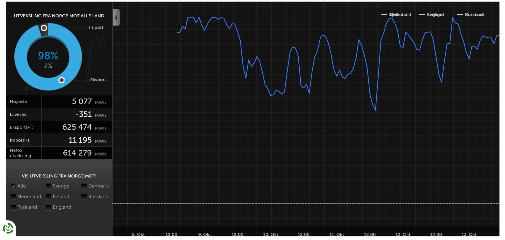 HF- Skrevet 8. oktober Skrevet 8. oktober sk0yern skrev (9 minutter siden): NO2 opp til 67,2% nå, opp 0,6%. 15,8% under median. Grunnet teknisk feil, er det ikke så lett å finne netto eksport ut av NO2 den uken, men alt tyder på at den igjen var svært høy. Tilsiget i NO2 var 1,0TWh, denne uken forventes 1,6TWh, 80% mer enn normalt. Vi hadde import under Amy, når alle rundt oss hadde for mykje vindkraft
