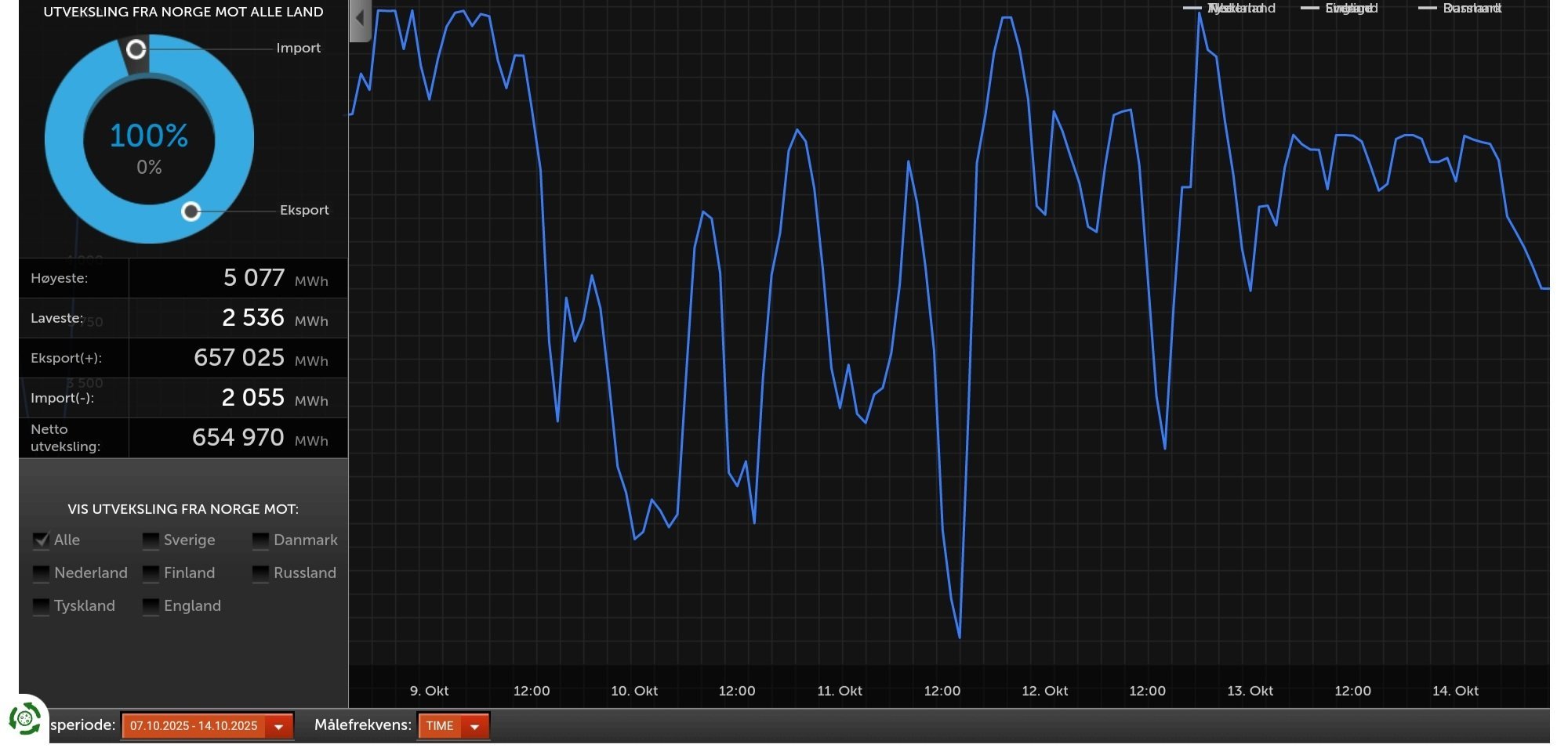 Simen1 Skrevet 1 time siden Skrevet 1 time siden (endret) Uvanlig, men ingen rekord med 99,7% eksport (tallet i kakediagrammet er avrundet). Det har vært 100% sammenhengende eksport over en hel uke før også, selv om det er lenge siden nå. Så vidt jeg husker har det ikke skjedd tidligere i år. __________ Spotprisen i NO2 skal vist opp i 347 øre/kWh i kveld kl 18.45-19.00 Endret 10 minutter siden av Simen1