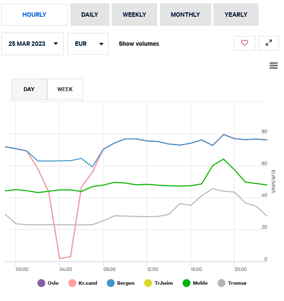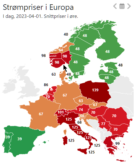 J-Å Skrevet 10. april 2023 Skrevet 10. april 2023 20 hours ago, Simen1 said: 2. påskedag kl 14-15 koster strømmen i Oslo og Kristiansand (NO1 og NO2), 2 øre/kWh. I Nord-Norge (NO4) betaler vi over 10 ganger mer da. Uten at det må leses som en klage. Flere vesteuropeiske land gir oss penger for å ta i mot strømmen deres da. https://www.nordpoolgroup.com/en/Market-data1/Dayahead/Area-Prices/NO/Hourly/?view=chart Det er interessant å se at i dag kjører Sverige opp vannkraftproduksjonen (blå) og eksporterer, mens Norge reduserer og importerer. NO5, som stort sett eksporterer kraft hele året, har nå den høyeste prisen i Skandinavia. https://www.svk.se/om-kraftsystemet/kontrollrummet/