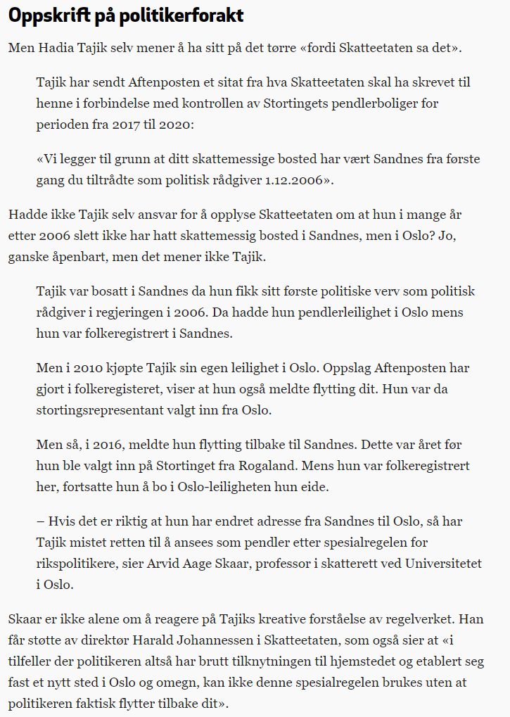 Theo343 Skrevet 5. mars 2023 Skrevet 5. mars 2023 (endret) I utgangspunktet er man beskyttet når man er en stortingsrepresentant. Men det er ikke slik at alle engasjement på stortinget er "vernet". Du husker sikkert Giskes sak når han satt i Finanskomiteen. Quote 7. januar gikk han av som nestleder i Arbeiderpartiet og stilte sin plass som partiets finanspolitiske talsmann på Stortinget til disposisjon. Dette er dagens. Jeg er fullstendig klar over at Tajik slapp alt for lett unna og de fleste har nok glemt alle sakene og detaljene - dessverre. Vi får jobbe for at det ikke blir glemt, akkurat som med Giske. https://www.rights.no/2022/03/tajik-saken-er-ikke-over-pendlerboligsaken-fra-2019-kan-ha-strafferamme-pa-to-ar/ At det foregikk mye lobbyvirksomhet rundt hennes sak er det ingen tvil om. Det ble brukt ekstremt mye penger på advokater for å få henne frifunnet og få skatteetaten til å droppe saken. Samt andre forhold. Hele saken var meget stygg. Jeg vet ikke om noen holder en oppdatert liste over alle sakene rundt Tajik men de er ikke få. At du ikke er klar over at det gis fengselstraff i Norge for blant annet skatteunndragelse sier vel sitt. Ellers er dette akkurat hva du utviser i denne saken Snikpellik. https://www.rights.no/2022/12/pengejuks-igjen-hadia-tajik/ Endret 5. mars 2023 av Theo343 1