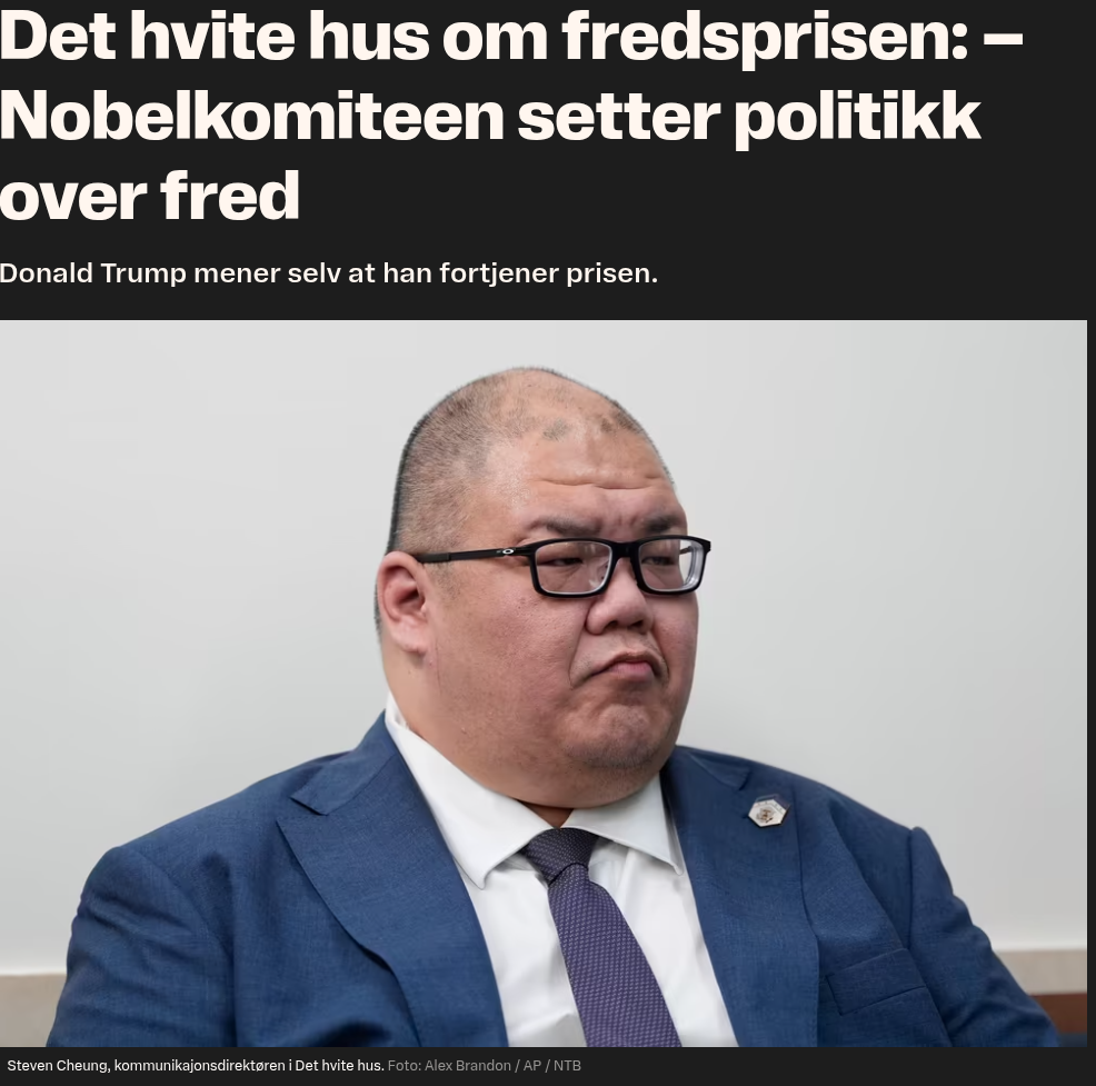 AlpakkaMafakka Skrevet 1 time siden Skrevet 1 time siden Hugo_Hardnuts skrev (1 minutt siden): Jeg finner bare at han ble nominert før fristen i 2021 og 2024. Ble han også nominert før fristen i år? Og gjelder nominasjonene fra året før også for neste års pris, eller må man nomineres på nytt? Han var aldri aktuell uansett siden Fredsprisen ble utdelt i år basert på fjorårets begivenheter. Trump ville aldri vunnet i år, selv om han alene ville vært ansvarlig for varig fred i Gaza.