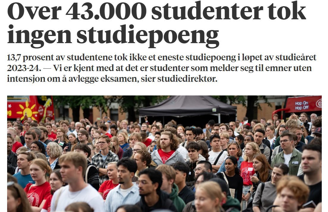 The Avatar Skrevet 15. oktober Skrevet 15. oktober Det er nok vanskeleg å få på plass eit system der studentar får det dei skal ha frå tilgang til universitetsbygget til studentrabattar når det er fyrst seinare at ein får klarheit i om studenten faktisk har studert og kan bevise det gjenom bestått eksamen. Nærmaste løysinga ein har er lånekassen sitt opplegg der "alle" får tilbod om gunstig lån, og så slepp du å betale tilbake alt om du består eksamenen. Det som gjer det spesielt vanskeleg med å bruke bestått eksamen som bevis for sin studiestatus er at at det kan være fleire grunnar til at ein ikkje består ein eksamenen. Spørsmålet er nok meir om ikkje studiestøtte og -rabattar burde være knytt opp mot kva ein studerer. Slik at det å melde seg opp til "jallafag" gir fordelar sjølv om ein ikkje hadde til intensjon om å avlegge eksamenen, men at disse fordelane er mykje mindre enn om studenten hadde meldt seg opp i meir samfunnsnyttige fag. Ei heilt anna retning hadde vært om studentgodane hadde blitt gjort om til goder for unge voksne. I dag så er det uansett veldig få som enten er i 100% jobb eller er 100% student, dei aller fleste kombinerer fulltidsstudier med deltidsjobb for å kunne finansiere studiane sine uansett, så om ein eller annan 22 åring som starta å jobbe på lager rett etter ungdomsskulen også får dra nytte av billeg bussbillett, så er kanskje ikkje det eit stort samfunnstap.