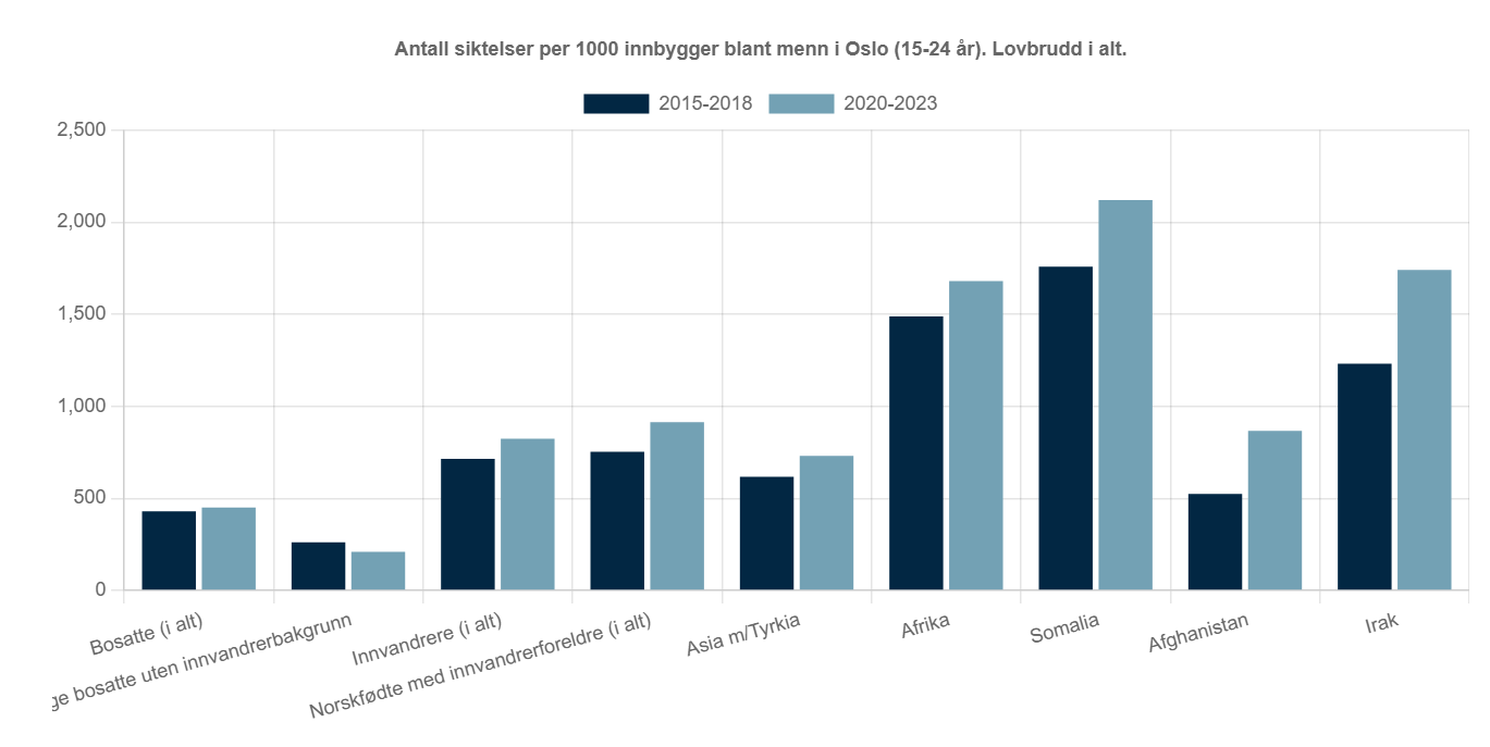 a_aa Skrevet 20. januar Skrevet 20. januar Kriminaliteten lokalt i Oslo øker, og innvandrere er tildels sterkt overrepresentert. Det er fakta. Men om den totale kriminaliteten i Norge øker eller ikke, er ikke bare avhengig av fakta i bunn, men også av hvor langsiktig man betrakter utviklingen: Ellers må man tilbake til 1955 for å finne en drapsrate som var lavere enn den Norge hadde i 2025: 2