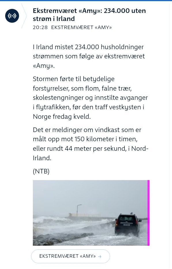 HF- Skrevet 2 timer siden Skrevet 2 timer siden Kraftig vind har ført til at mange er uten straum i Irland. Har uværet ført til konsekvenser der du er?