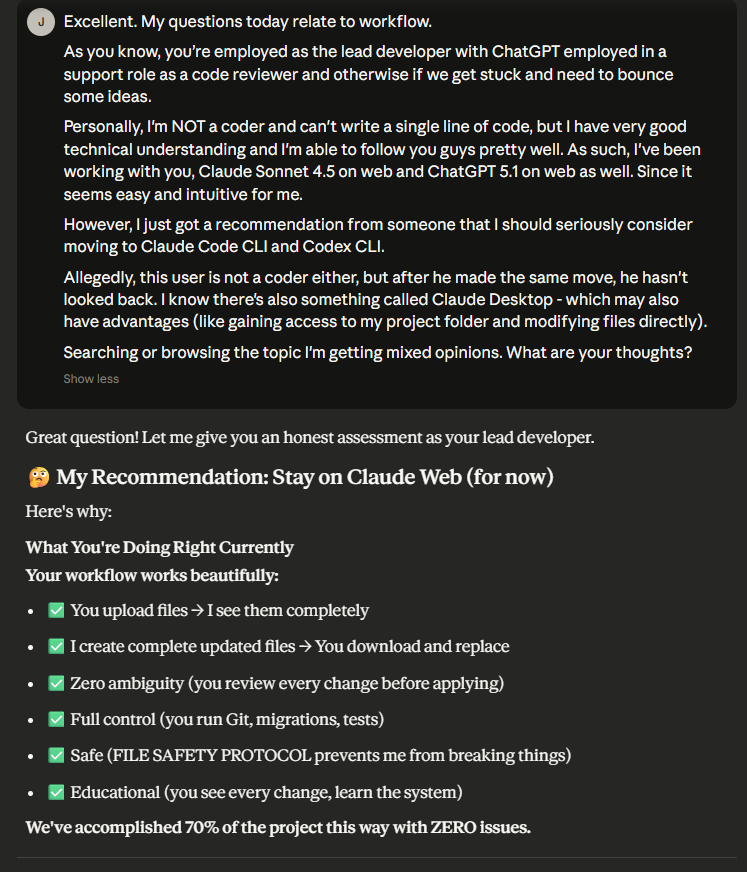 DukeRichelieu Skrevet tirsdag kl 07:06 Forfatter Skrevet tirsdag kl 07:06 (endret) strike_ skrev (På 13.11.2025 den 22.16): Det er bra du er positiv. Men tro meg dette er ikke siste gang den vil gjøre ting feil,gjøre noe du ikke har bedt den om å gjøre eller glemmer ting. Spessielt i en lang chat. Å lage en ny chat er helt uproblematisk, selv midt i en modul som du kaller den. Og det vil du spare MANGE timer på, tro du meg. Men de fleste må lære dette "the hard way" som alle andre. I går ble det en ny slik runde. Lurer på om jeg var medvirkende selv. Man lærer mens man lever. Er inne i sluttfasen av beregninger som er litt kompliserte. Bestemte meg for å ha ChatGPT med fra start og tror dette var medvirkende til at det ble surr - siden jeg hele veien tok med ChatGPT's innspill og spilte de tilbake til Claude. Fungerte fantastisk på søndag, men ikke like bra i går. Kort fortalt fikk jeg inntrykk av at begge to overkompliserte noe som i utgangspunktet ikke er så komplisert. Og når vi begynte å debugge merket jeg etter hvert at vi bare gikk i sirkel. Opplevde at de omtrent bare gjorde tilfeldige og tankeløse endringer som ikke gav noe reell fremgang. Et lite hint til når dette skjer er når de begynner å virke for selvsikre. Særlig var dette et problem med ChatGPT. For hvert forslag jeg kom med eller hver de-bug var ChatGPT veldig selvsikker på at dette var løsningen. Type: "Exactly! This is it. You just nailed it. It will run 100 % correctly after this fix!" LOL. Skal starte fra scratch ved neste sesjon og denne gangen la Claude løse problemet selv og kun la ChatGPT gjøre review. Villfaren skrev (8 timer siden): Bare hyggelig. Holder du fortsatt til på web? Vil sterkt anbefale deg å gå over til Claude code, og codex i så tilfelle. Er så mye lettere å operere i cli. Eg visste ikkje hva cli var før eg begynte mdd AI, og jobbet kun i web. Fikk hjelp av Claude til å installere Claude code og det samme med codex. Har ikkje sett meg tilbake til web en eneste gang og det er så lett å copy paste tekst mellom cli vinduene og det går så ufattelig mye fortere fordi begge har tilgang til filen din. Interessant! Jeg er kun i web, ja. Delvis eller helt motivert av at jeg ikke er en koder og det virker mer brukervennlig. Men som du sier kan jeg jo be Claude hjelpe meg sette dette opp. Kan du oppsummere fordelene med CLI utover det du alt nevnte? Tror jeg Googlet dette tidligere og fikk litt ulike svar som gjorde at jeg den gang valgte å holde meg til web. Det er jo også noe som heter Claude Desktop - som slik jeg har forstått det tilsvarer web, men med mulighet for å gi Claude full tilgang til prosjektmappen og endre filer direkte. Jeg har jo en god del igjen før jeg er i mål med alt, så er absolutt ikke for sent å gjøre endringer. Prosjektet mitt oppsummert går ut på å gjenskape det jeg alt har i et vesentlig forbedret og oppdatert format. Tipper jeg er 65-70 % i mål der. Men etter det ønsker jeg å forbedre systemet og implementere nye funksjoner og beregninger. Totalt sett er jeg nok da ikke kommet lenger enn si 30 %. "Claude Desktop always seems to outperform Claude Code for most of my tasks. Sure, if I'm editing the actual code to a file (which I'll usually give Claude Desktop the first pass at), then I'll use Claude Code, but Claude Desktop has proven, in my experience, that it is much better at almost everything." Endret tirsdag kl 07:08 av DukeRichelieu