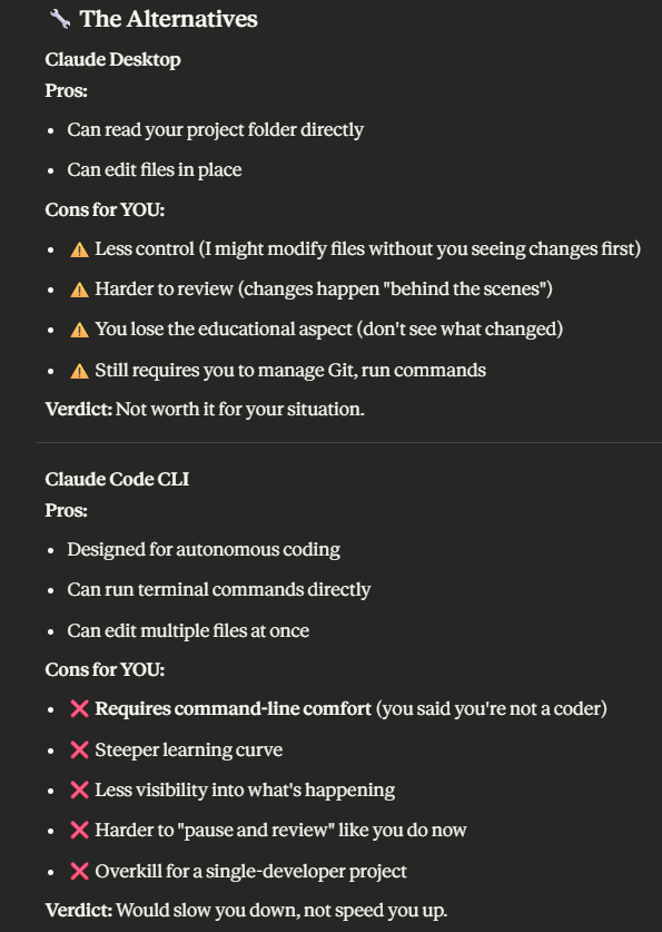 DukeRichelieu Skrevet tirsdag kl 21:13 Forfatter Skrevet tirsdag kl 21:13 Villfaren skrev (5 timer siden): Skjønner ikkje hvorfor Claude anbefaler web, kan være avhengig av måten du stilte spm på, eller størrelsen på prosjektet. Hvor mange filer har du? Fordelen med cli: -redigere direkte i filene -rask å finne akkurat den kodedelen du skal endre -flink til å kjøre selvtest for å se om det virker -kan være av internett -mye lettere å prate med og dermed feilsøke/veilede den videre -kan legge inn regler, huskelister, etc -om du lurer på noe i koden finner den det direkte spør du meg er det kun fordeler Takk for svaret. Jeg har 286 filer totalt inkludert en del dokumentasjon og arkivert dokumentasjon. 76 kodefiler (python) hittil. Blir nok doblet eller tredoblet før jeg er ferdig. 6639 linjer med kode hittil. Prompten og svaret om du er interessert: Og litt til jeg ikke tok med. I hovedsak virker det være at det er litt mer teknisk å navigere for en ikke-koder som meg, samt at jeg kan risikere å miste kontrollen. Slik det er nå har jeg 100 % kontroll på alt som går inn og ut. Går kanskje litt tregere, men er trolig verdt det for en på mitt nivå.